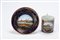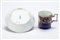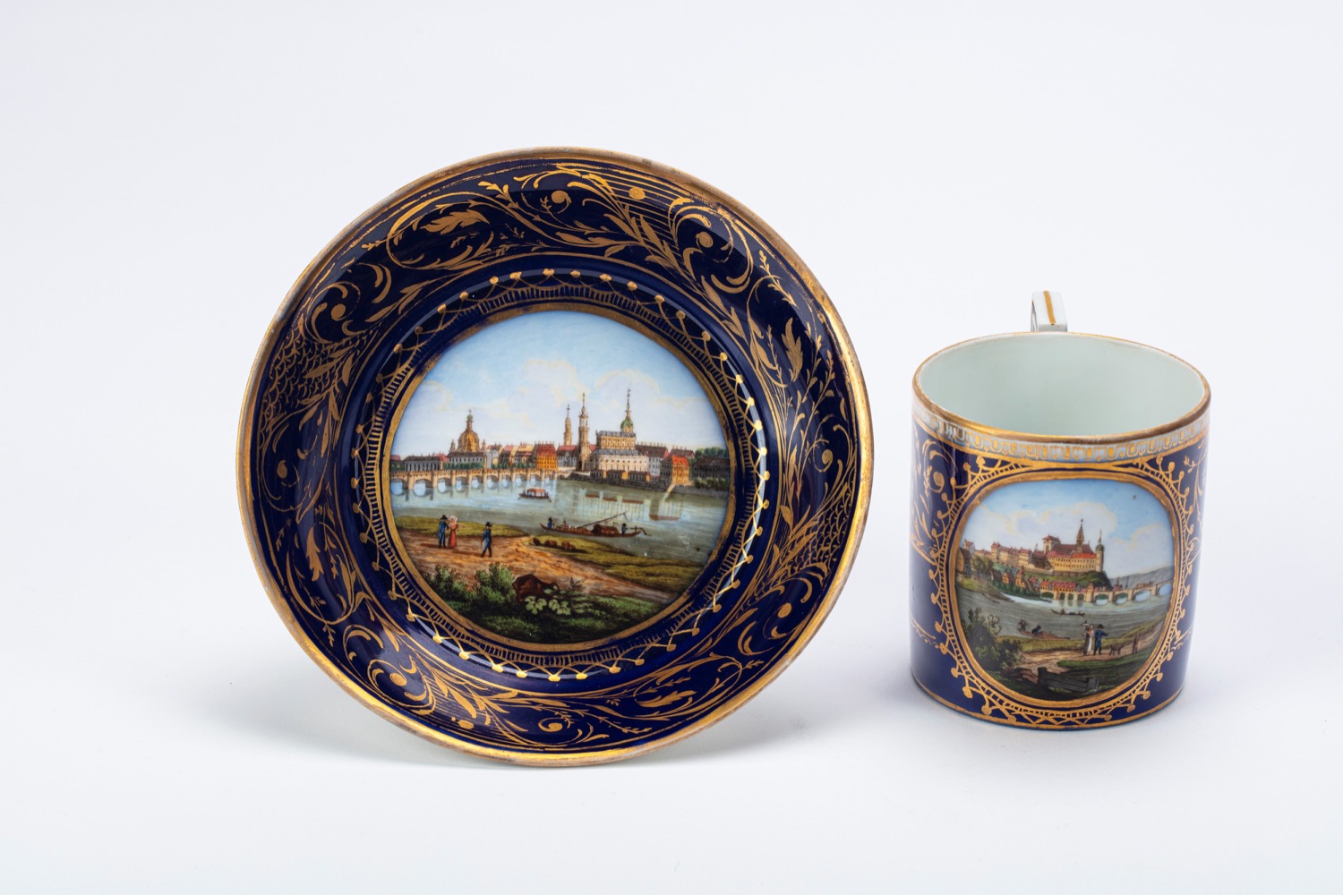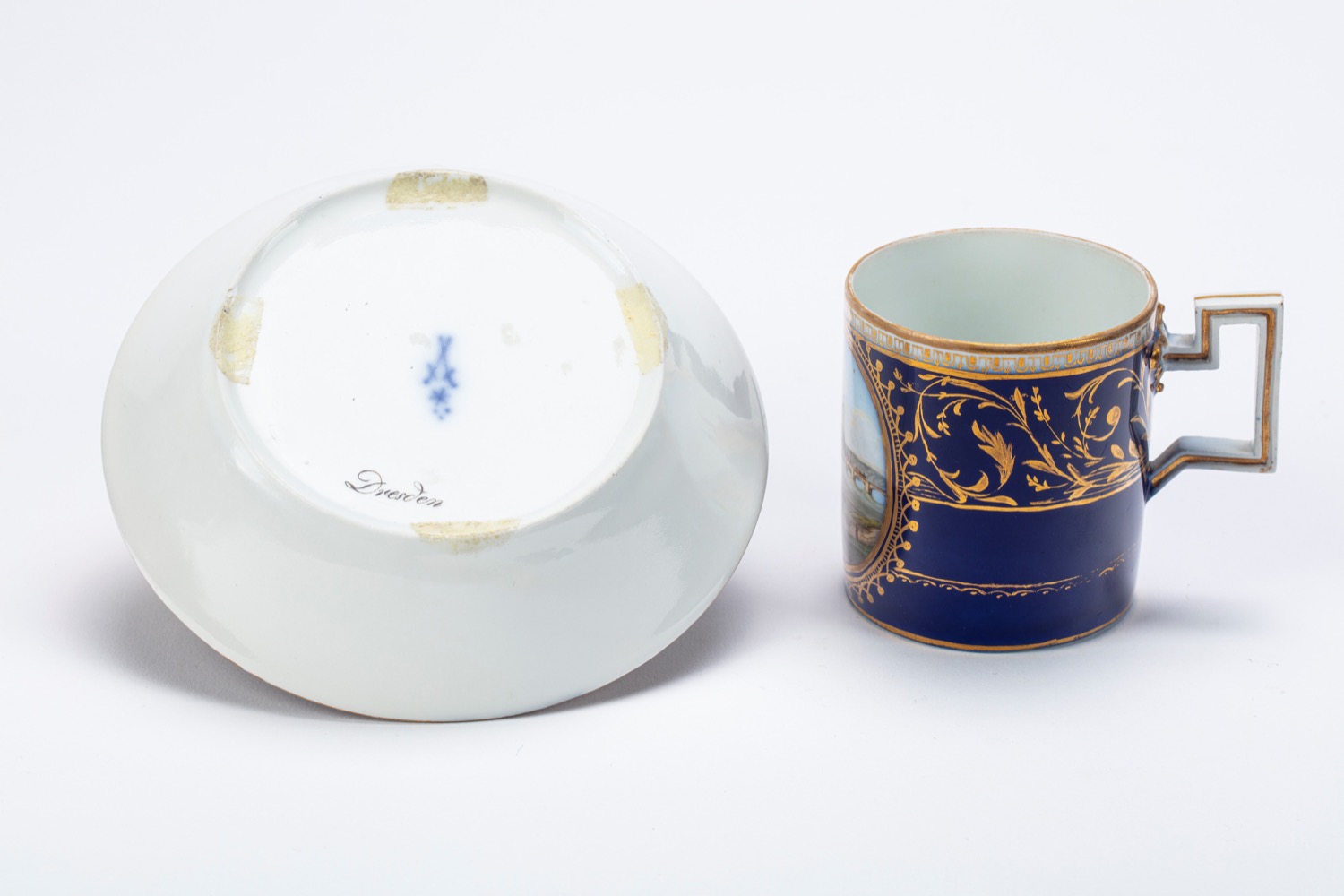 Tazza a "litron" con ansa squadrata, piattino ad alta tesa. Porcellana a fondo blu con volute fogliate e profili dorati, decorata con vedute policrome di Meissen nella tazza e Dresda nel piattino entro riserve. Inscritti al retro Dresden e Meissen, marca di fabbrica.Tazza a "litron" con ansa squadrata, piattino ad alta tesa. Porcellana a fondo blu con volute fogliate e profili dorati, decorata con vedute policrome di Meissen nella tazza e Dresda nel piattino entro riserve. Inscritti al retro Dresden e Meissen, marca di fabbrica.