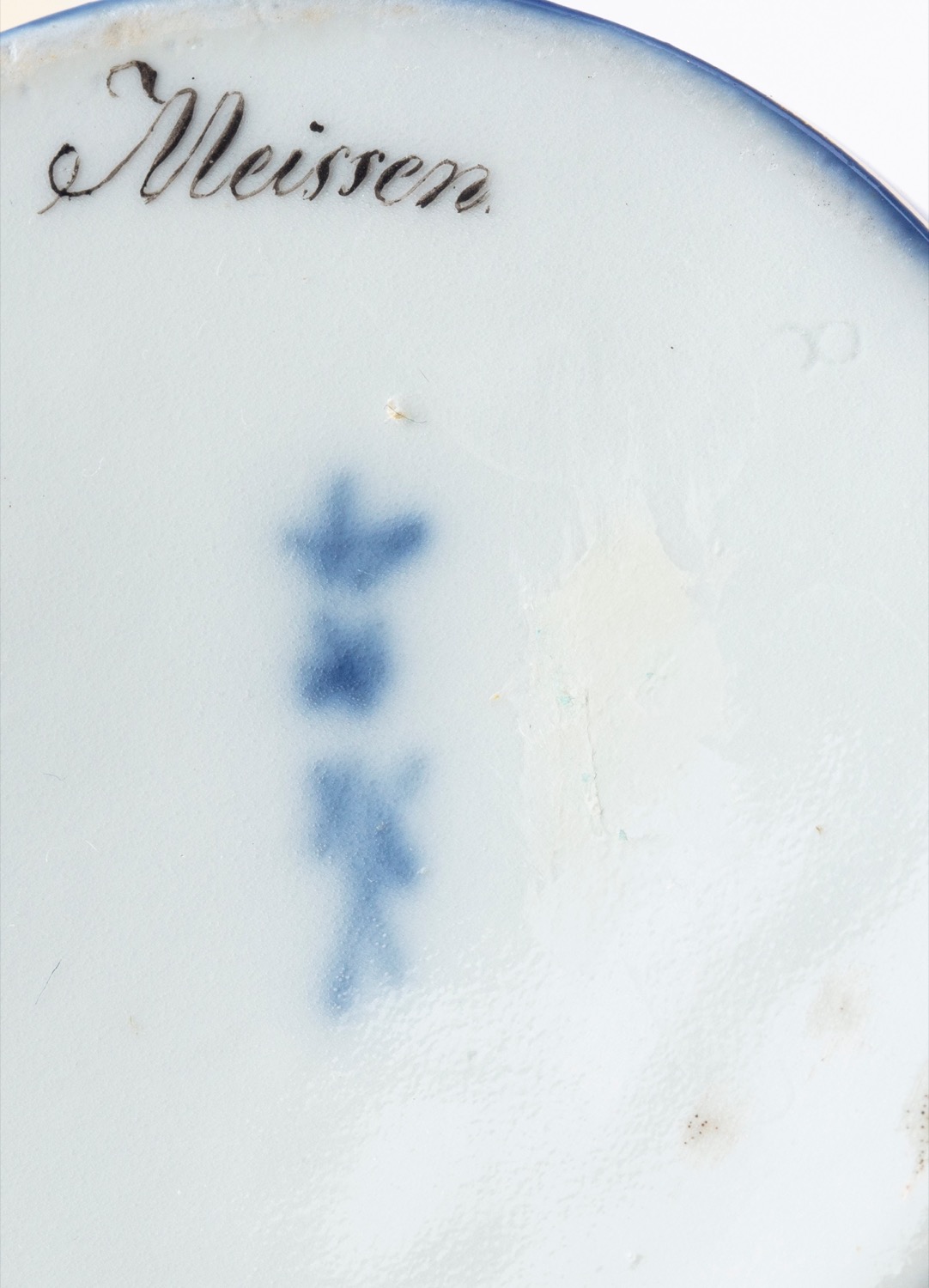 Tazza con piattino in porcellana policroma con vedute di Meissen e Dresda. Manifattura di Meissen, circa 1815