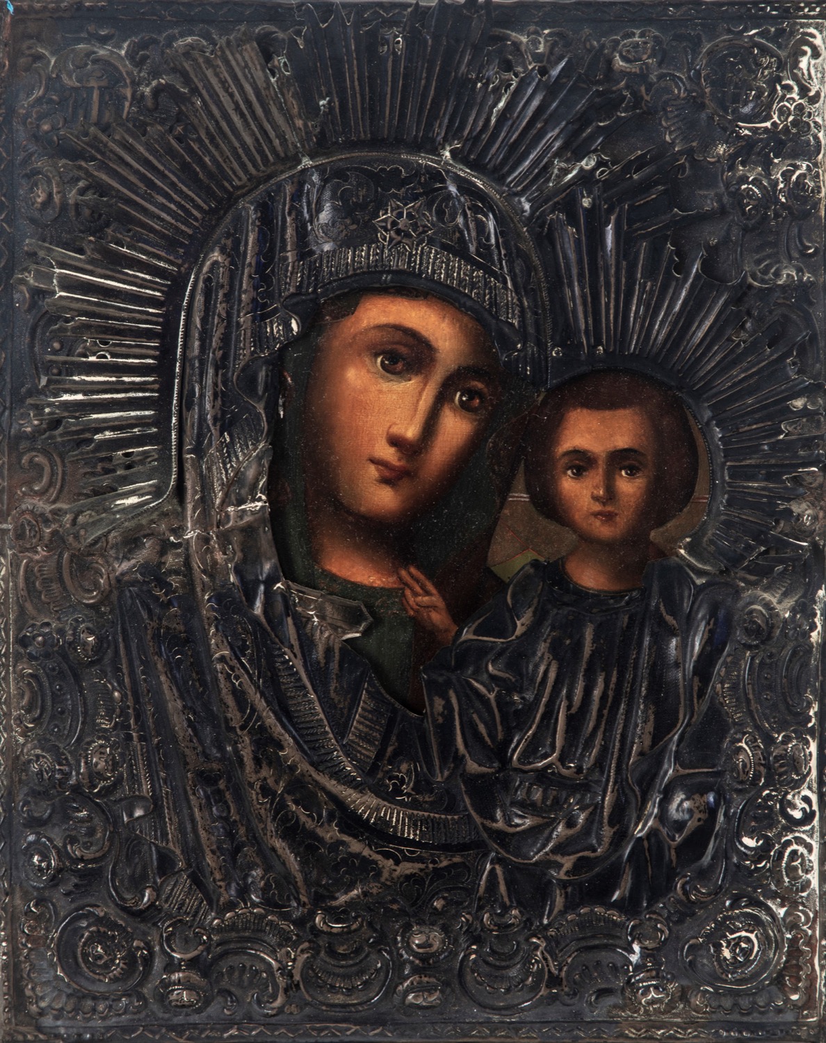 Icona raffigurante la vergine di Kazan, tempera su tavola con riza in argento. Russia, secolo XIX
