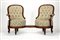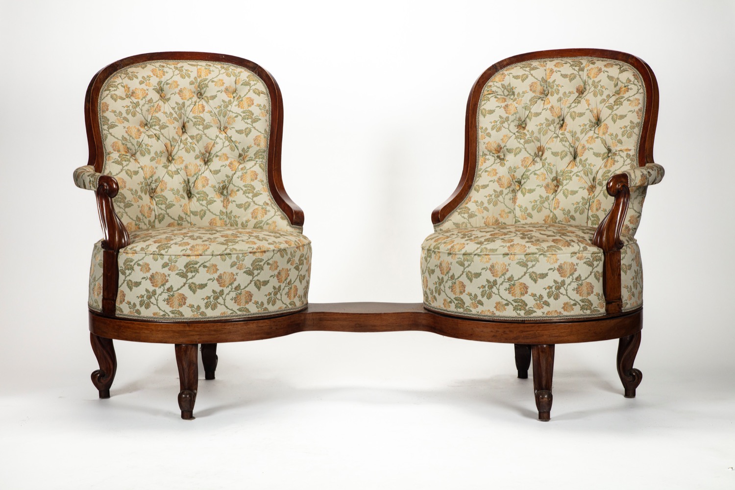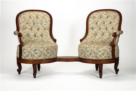 Divano in legno intagliato a due poltrone girevoli. Secolo XIX