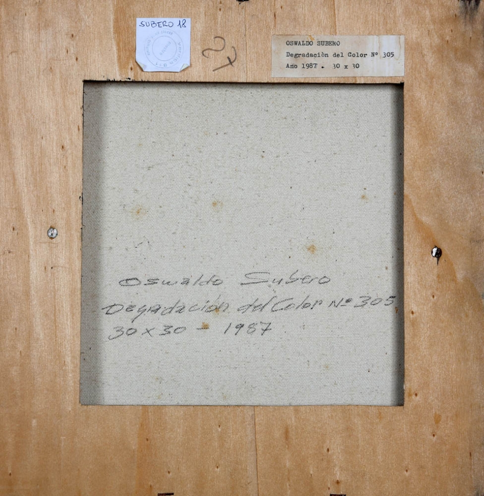 OSWALDO SUBERO 1934 " Degradaciòn del Color n. 305 ", 1987 Acrilico su tela, cm. 30 x 30 Firmato e datato in basso a sinistra Timbro Associazione Culturale Verifica 8+1 Mestre sul retro Prov. Collezione Privata