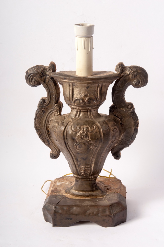 Porta palme elettrificatoin legno e lamina di rame argentata di forma Barocca a balaustro. Lamiera a rilievo incisa.