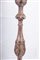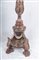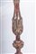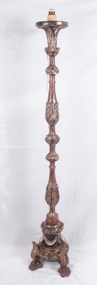 Piantana in legno doratoscolpito ed inciso con base a tre piedi da appoggio ferini, fusto cilindrico con elementi decorativi floreali, apice a disco.