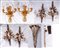 Lotto di otto appliques da murodi cui: quattro a due luci in cristallo ed ottone, due a tre luci in bronzo dorato con decori a palmette e due a goccia in ottone.