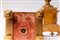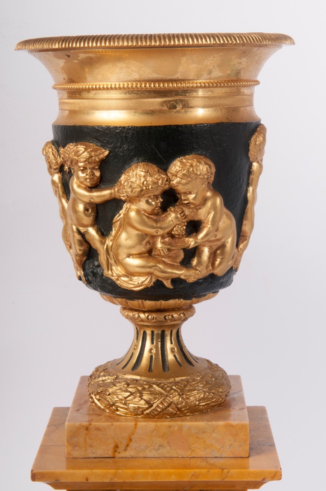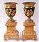 Coppia di potichesbase a plinto in marmo giallo di Siena con quattro piedi da appoggio in bronzo quadrangolari dorati. Alzata a calice in bronzo dorato con fascia di amorini lungo il corpo su fondo nero.