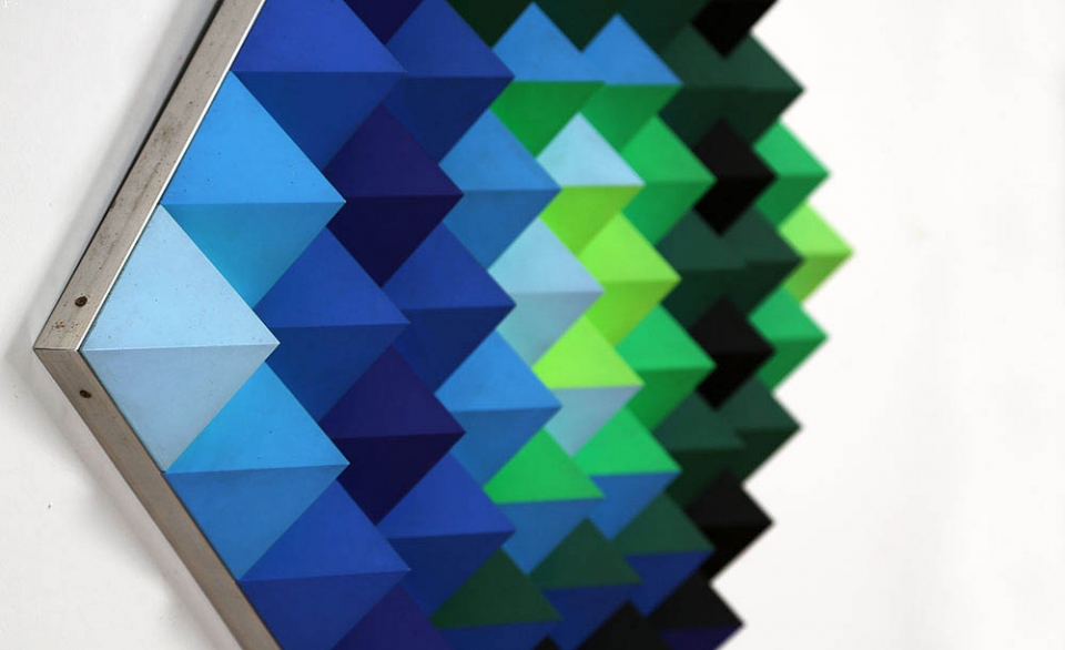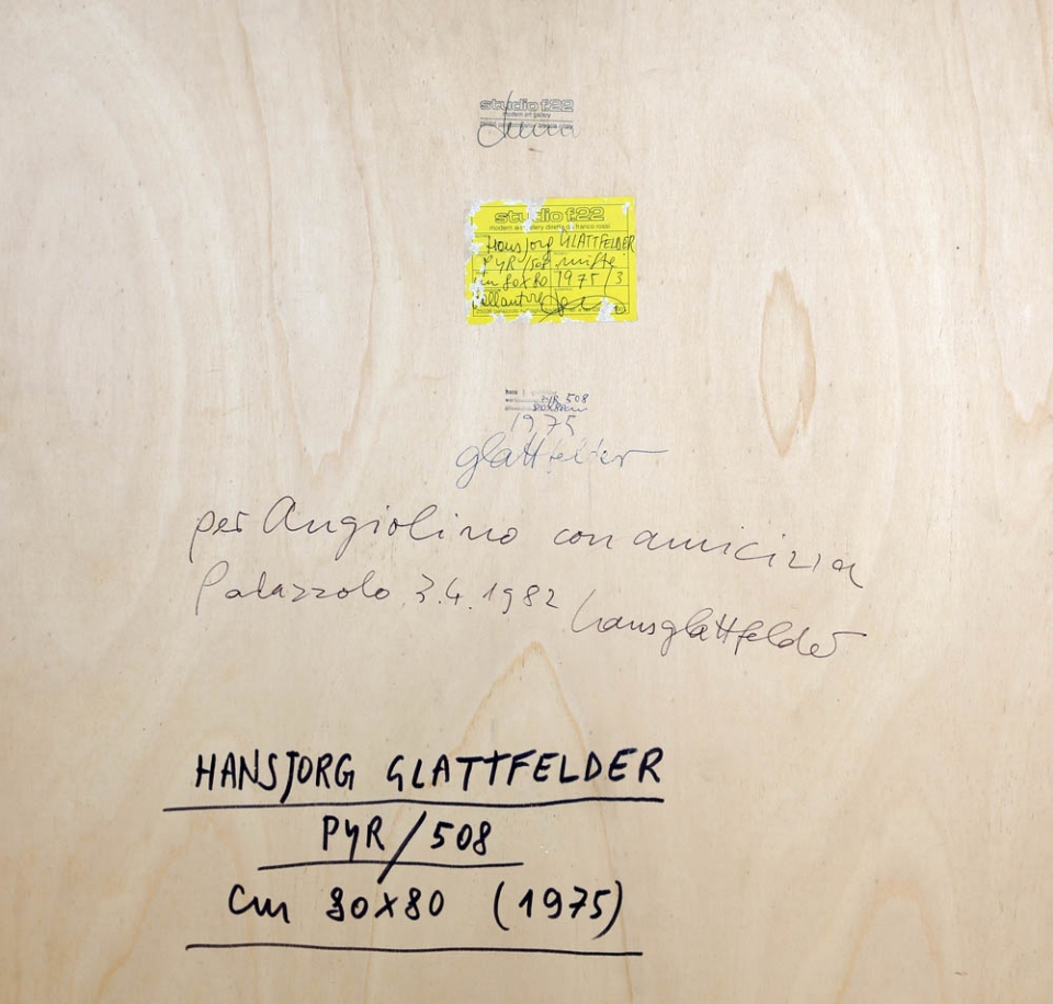 HANS JORG GLATTFELDER 1939 " PYR 508 ", 1975 Rilievi con piramidi, cm. 80 x 80 x 10 Firmato e datato sul retro Timbro dell'artista sul retro Dedica dell'artista sul retro Etichetta Studio F22 Palazzolo sul retro Fotografia dell'artista con l'opera Prov. Collezione Privata