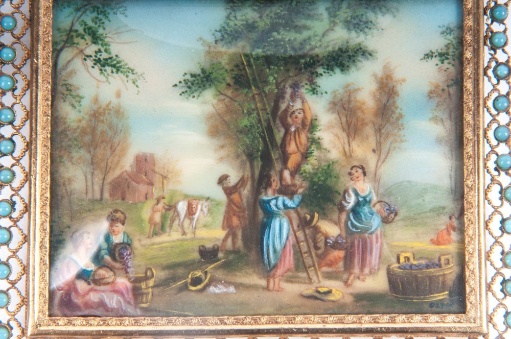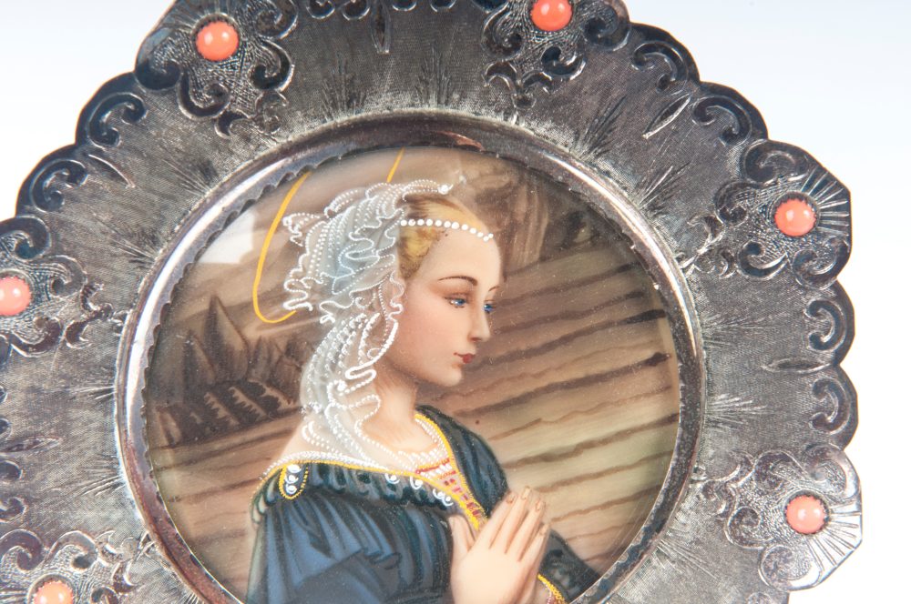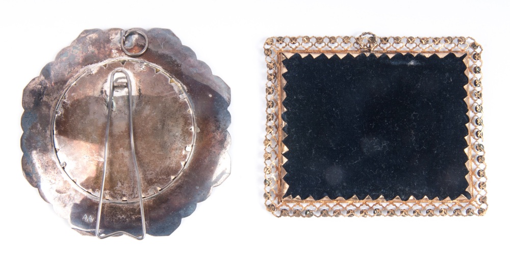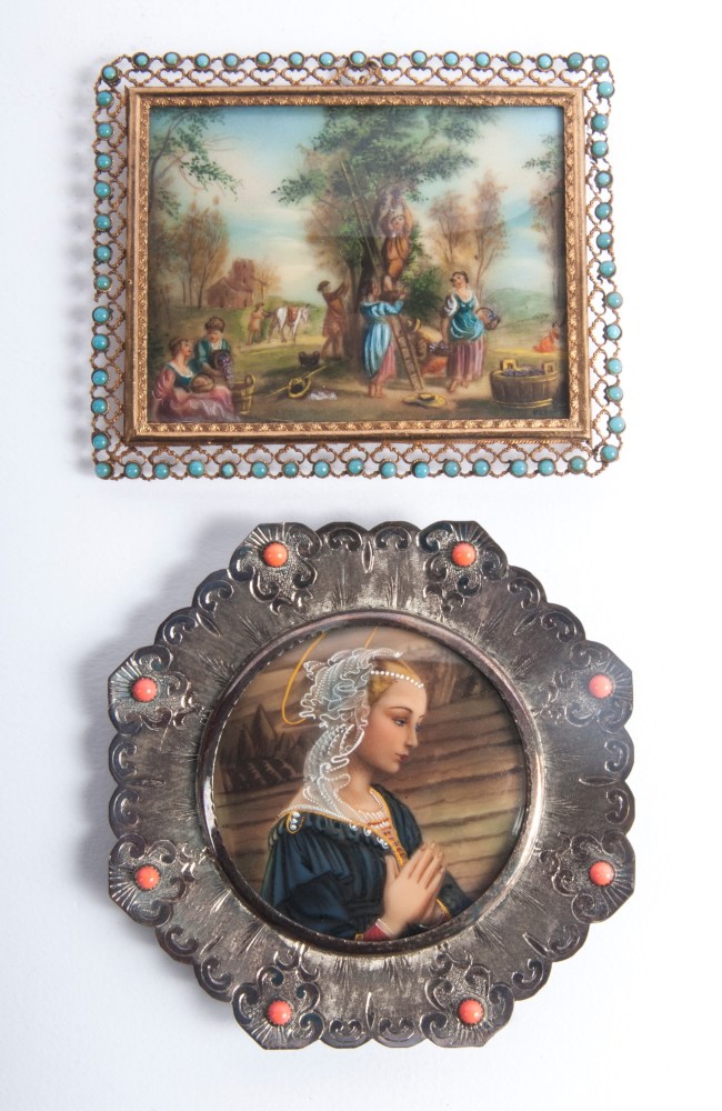 Lotto di due miniature: una ad assetto tondo con Madonna a stampa entro cornice in argento ottagonale e corallo; l'altra ad assetto rettangolare con scena bucolica con personaggi dipinta entro cornice in ottone e vetri azzurri.