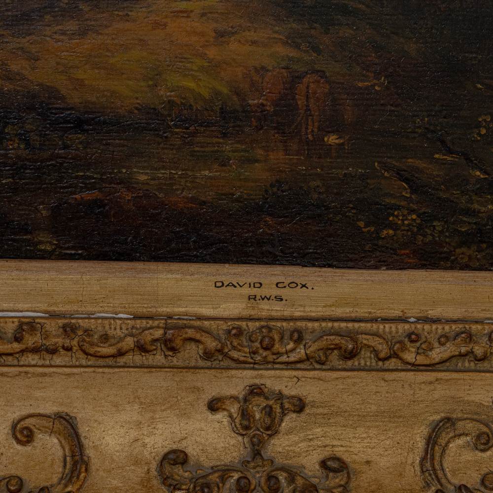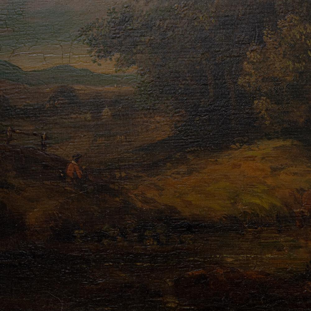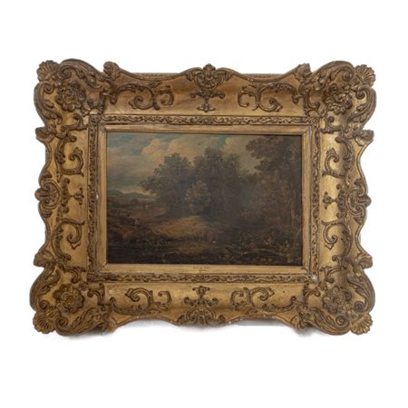 Scorcio di paesaggio con pastore e mucchein cornice dorata coeva.