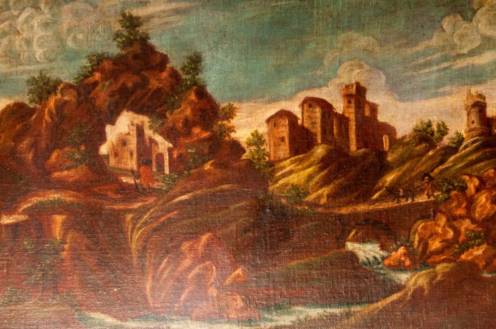 coppia di paesaggi con architetteture fine XIX inizi XX secolo dipinto olio tela 64 x 115 cm