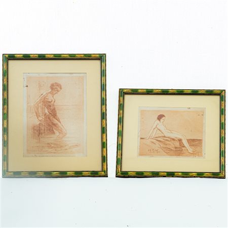 Lotto di due nudi femminili, multipli su cartafirmati in cornice.