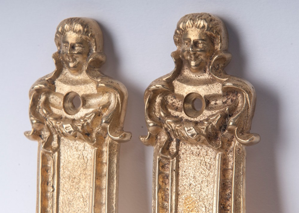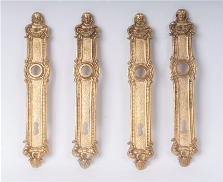 Lotto di trentuno piattine per chiusura di portain bronzo di forma rettangolare, terminanti con testa maschile.