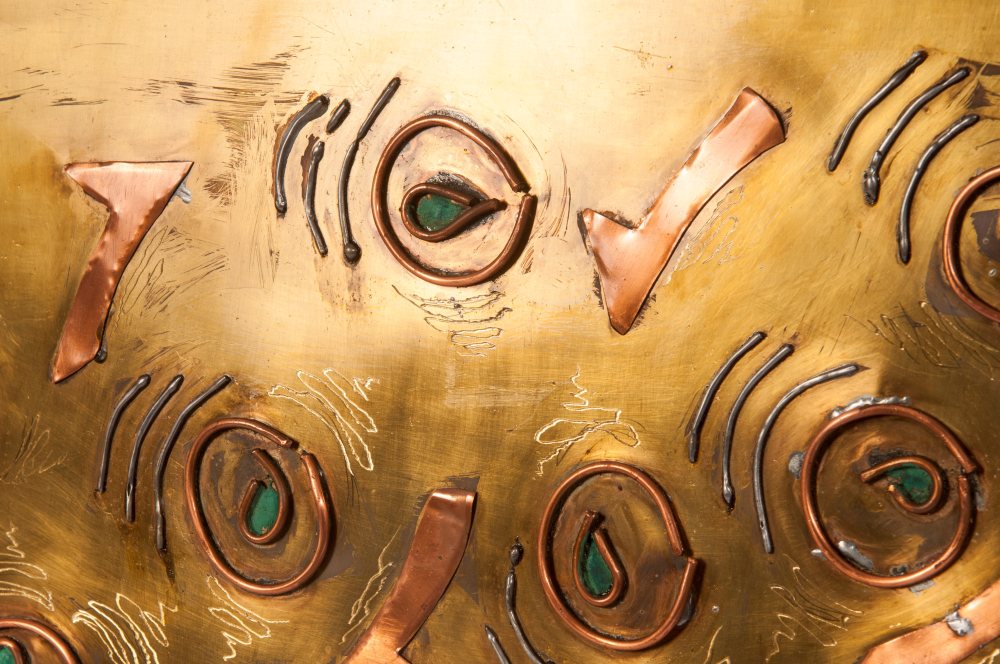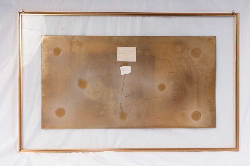 "Forme in movimento n.2 "scultura su piastra in ottone con applicazioni in rame e acciaio fissata su plexiglass in cornice. Firmata e datata