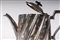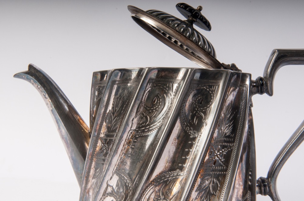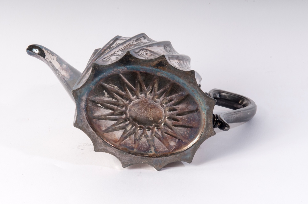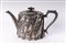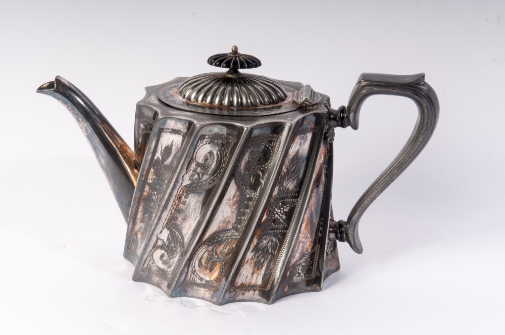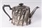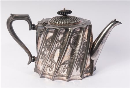 Teiera in metallo argentatodal corpo rettangolare costolato con parti incise a motivi floreali e presa ad ansa.