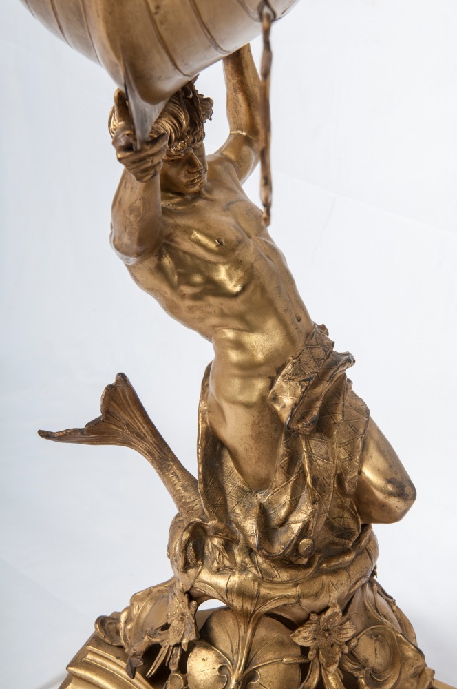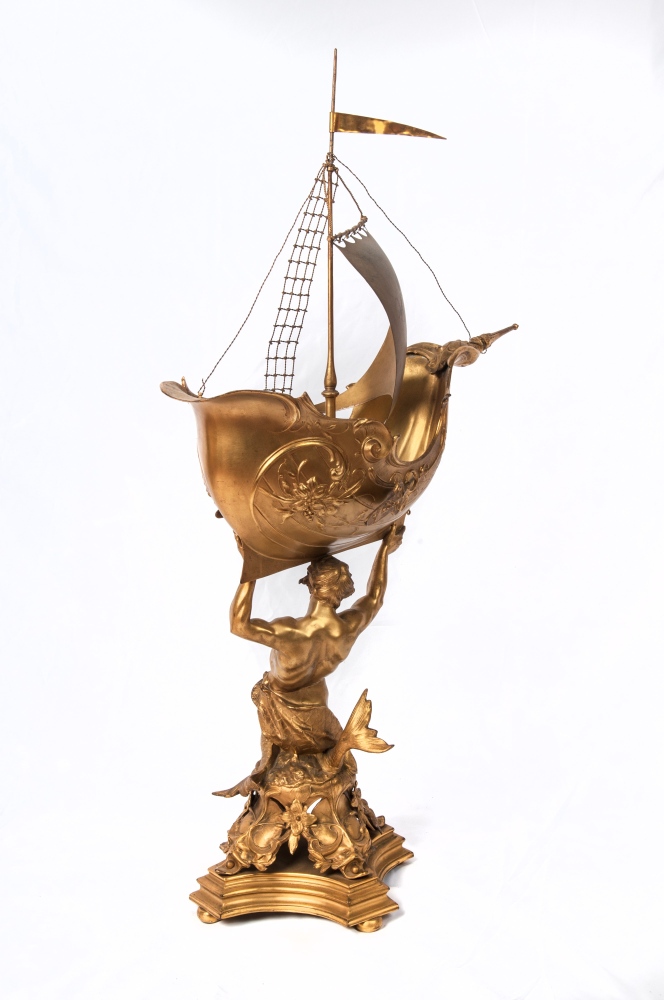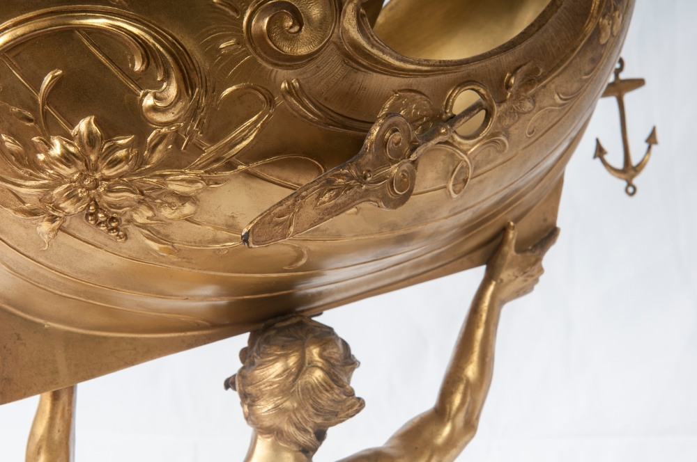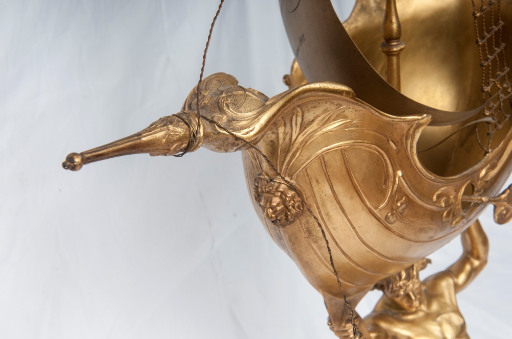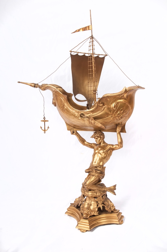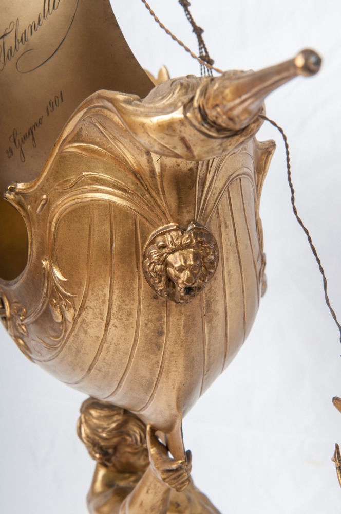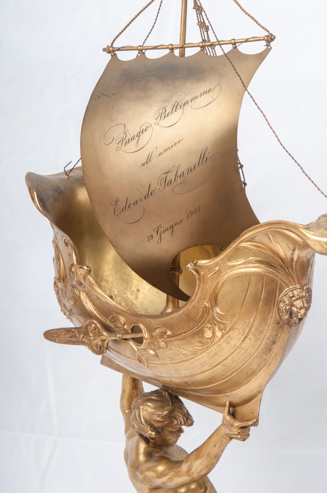 Tritone che sostiene una barca , scultura in volumesu base quadrangolare fogliacea in metallo dorato. Regalo con firma e dedica 29 giugno 1901