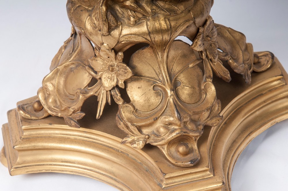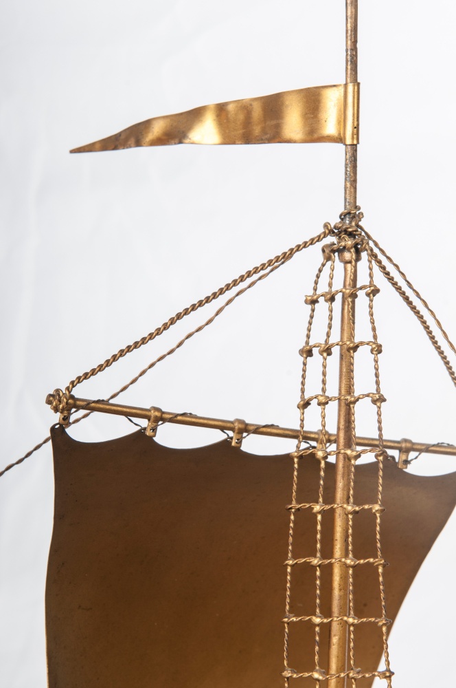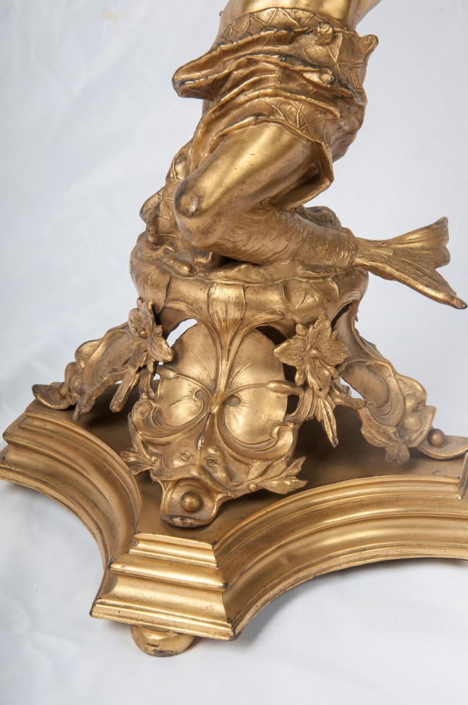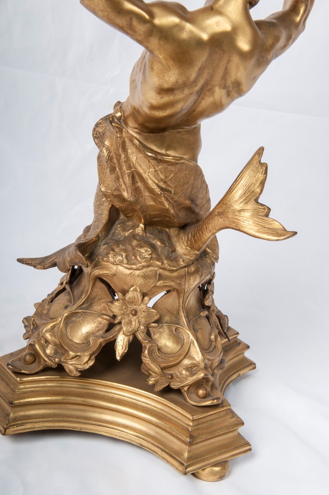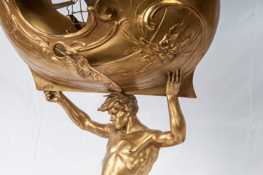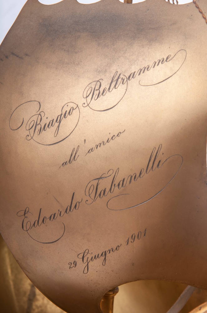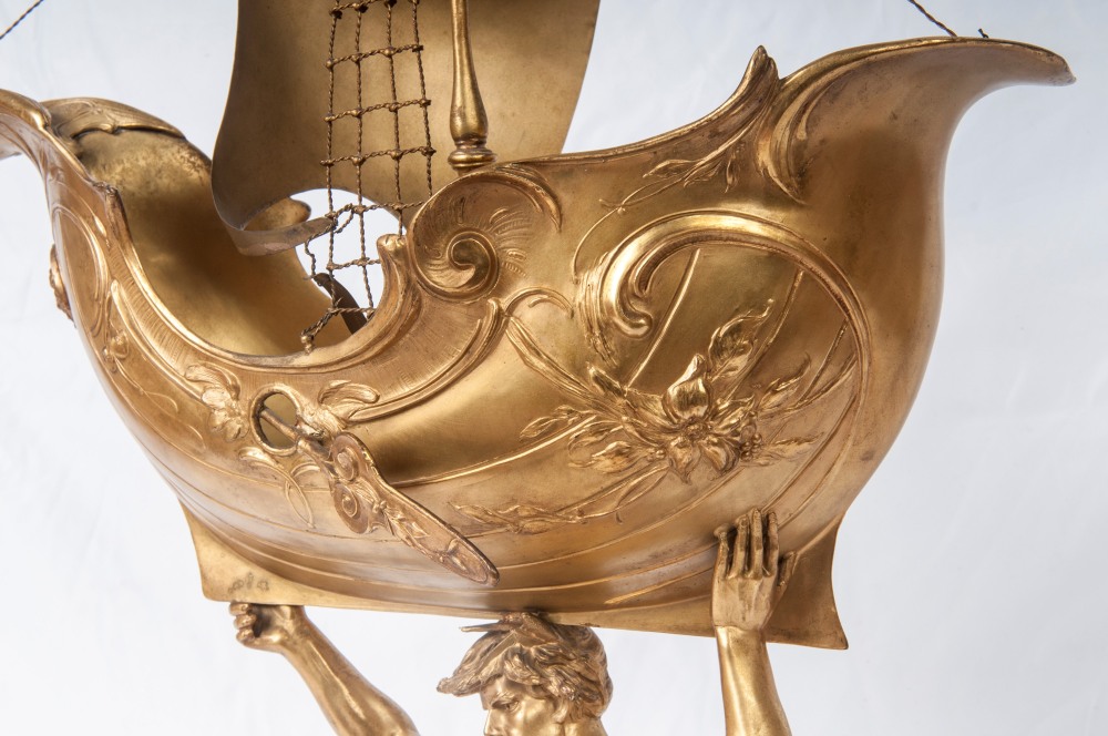 Tritone che sostiene una barca , scultura in volumesu base quadrangolare fogliacea in metallo dorato. Regalo con firma e dedica 29 giugno 1901