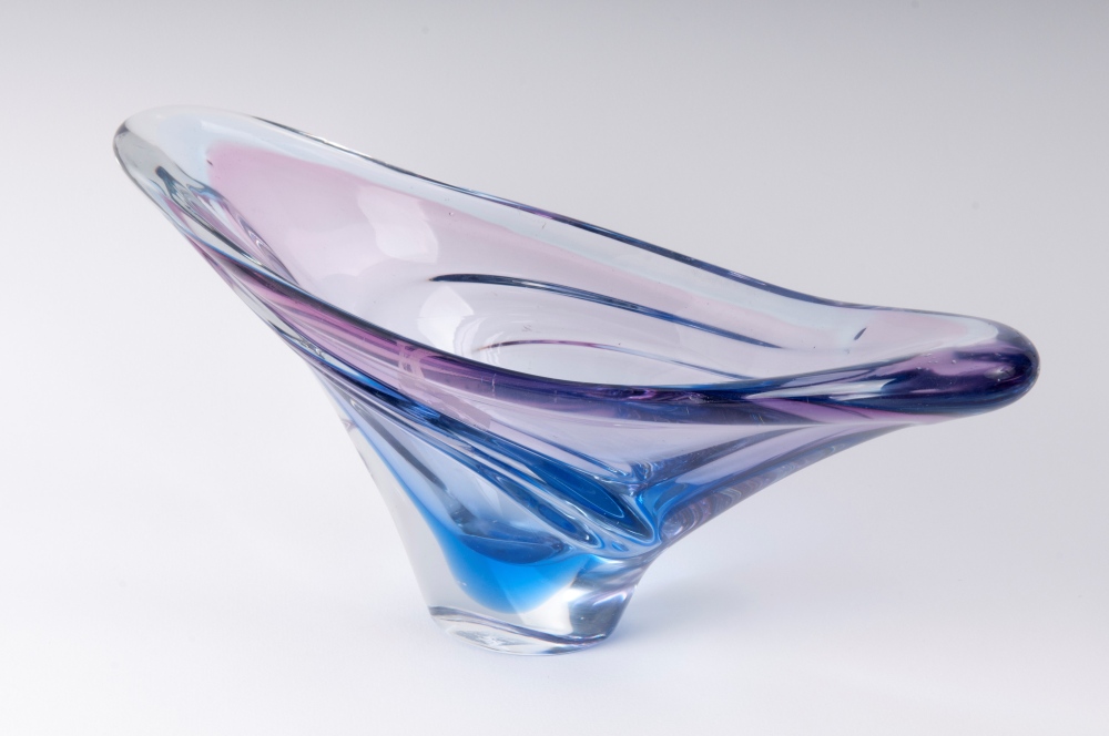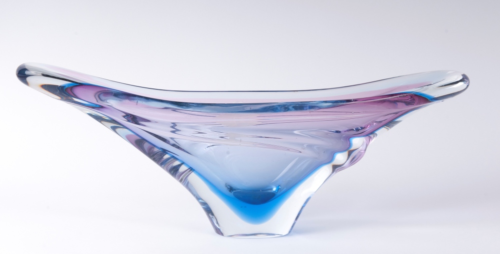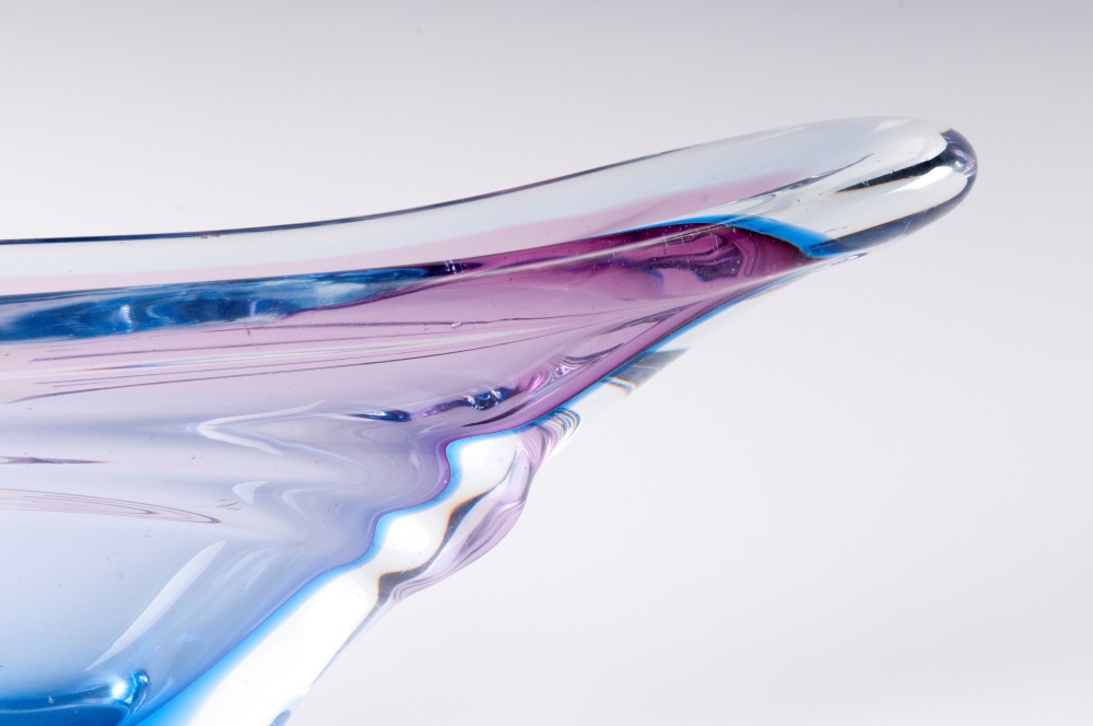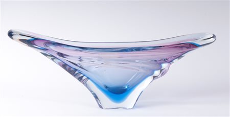 FLAVIO POLI - SEGUSO VETRI D’ARTE Centrotavola in vetro sommerso a nuaces viola e blu anni' 60 15 x 43,5 x 12 cm