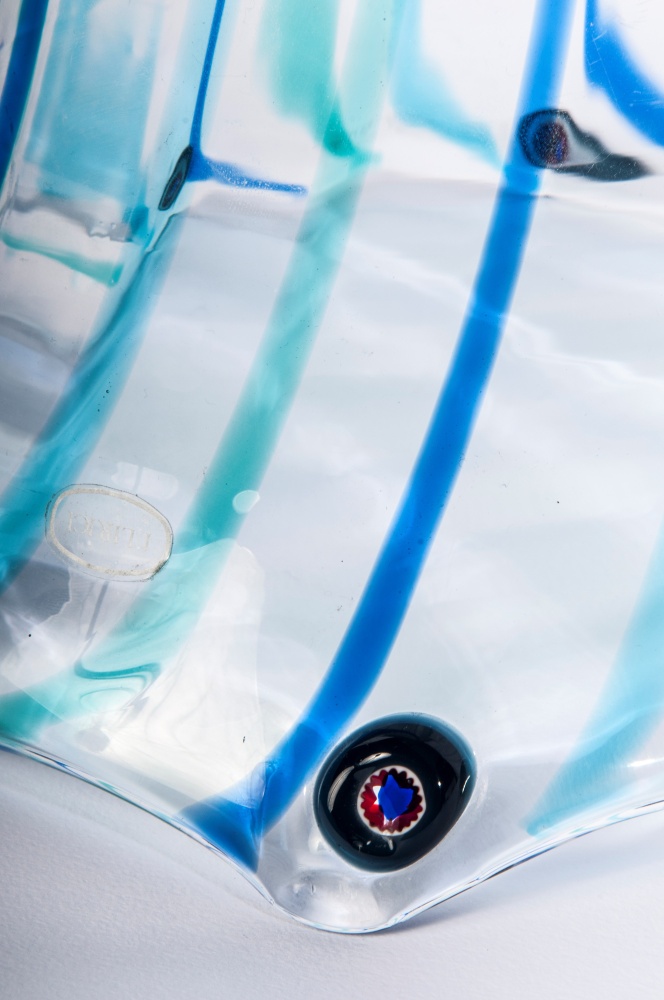 Cornucopia in vetro di Murano a righe orizzontali nelle cromie verdi e blu. Orlo superiore mistilineo a sette punte con occhio di pernice alla base.