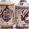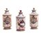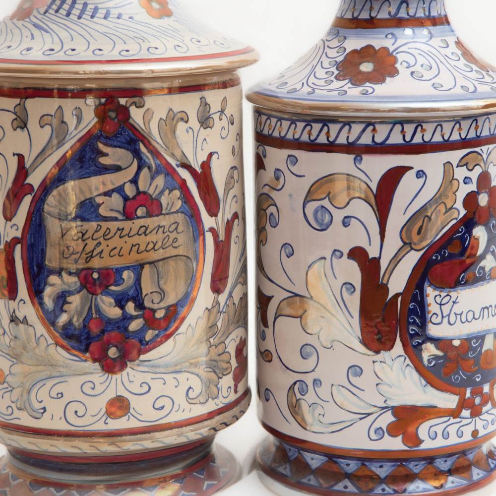 Lotto di tre albarelli in ceramica a lustrocon coperchi .