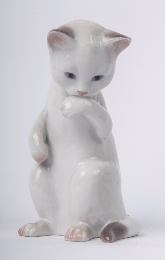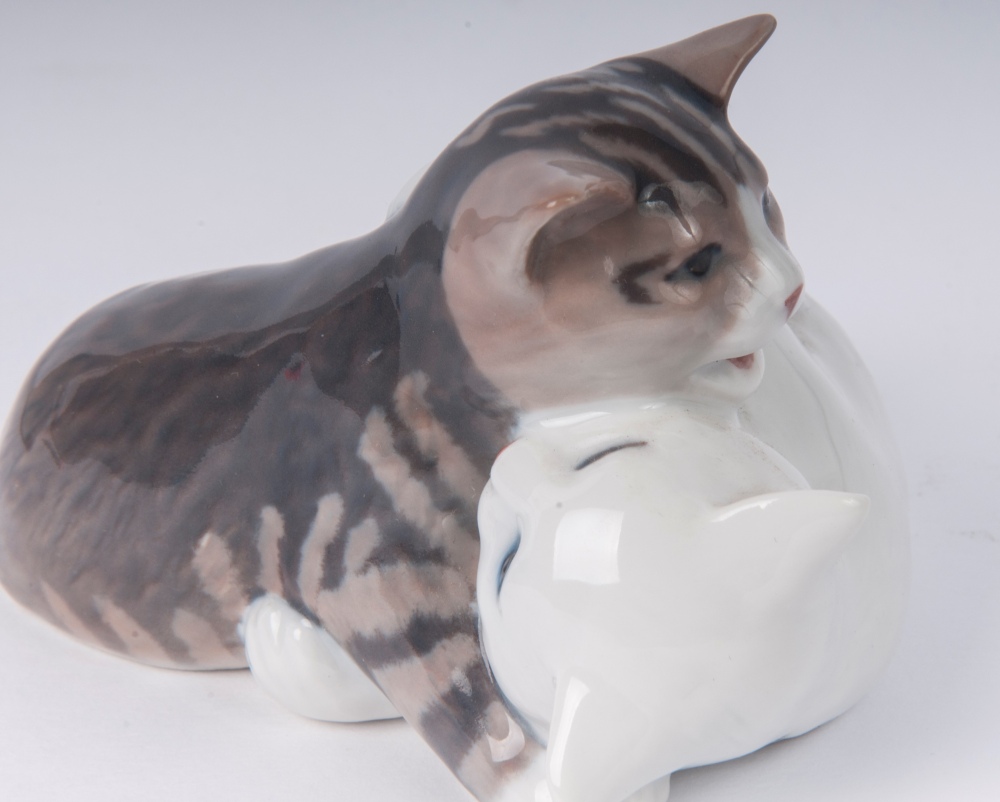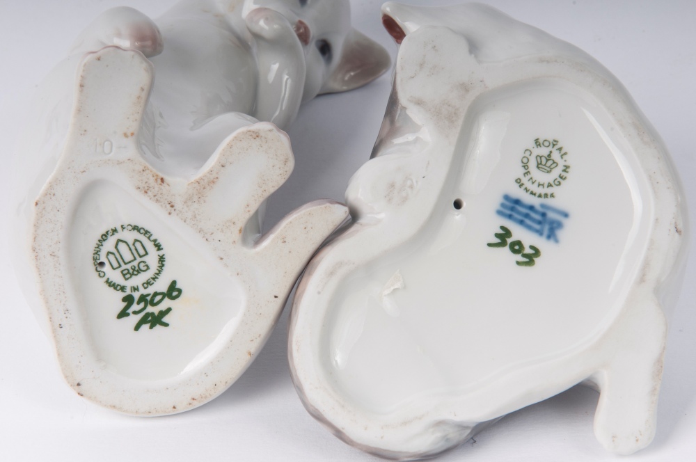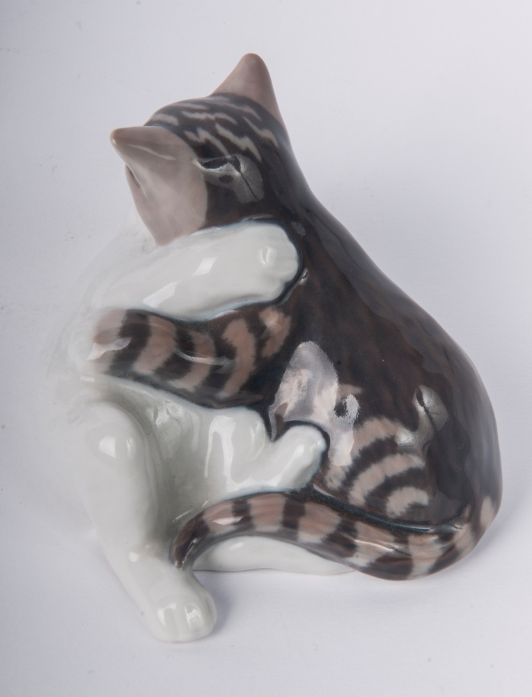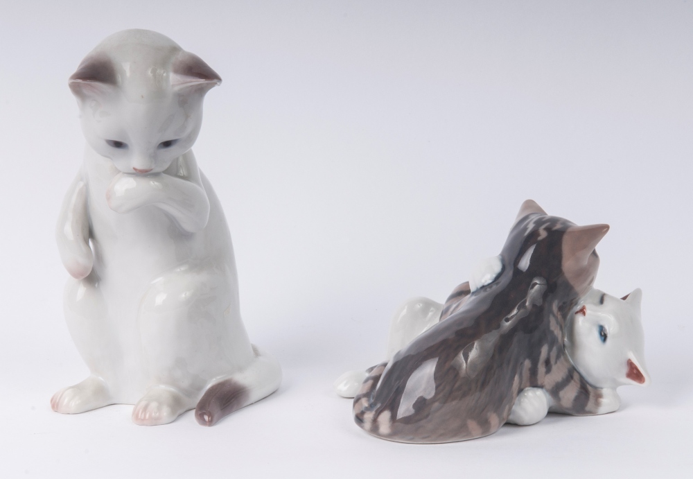 Lotto di due sculture a forma di gattoin porcellana policroma. Manifattura B.& G. e Royal Copenhagen