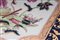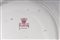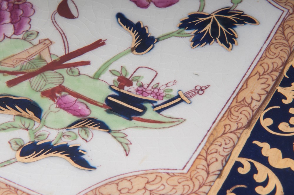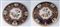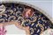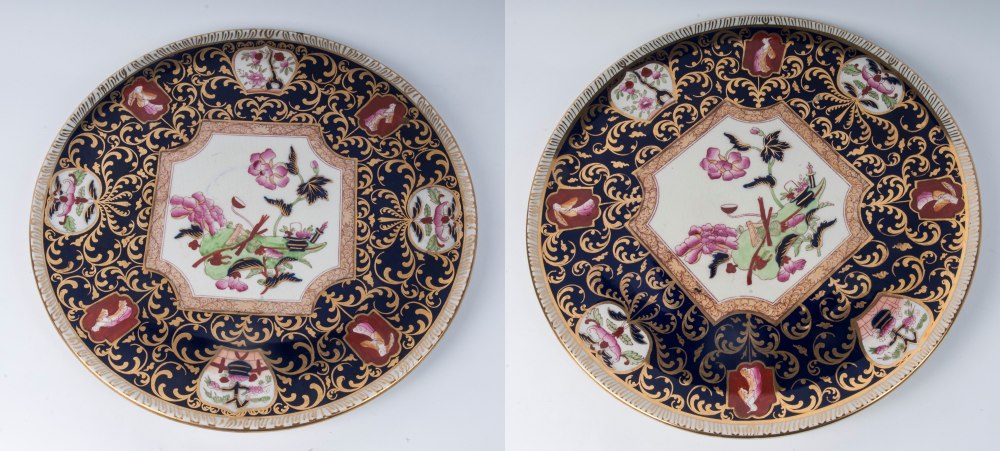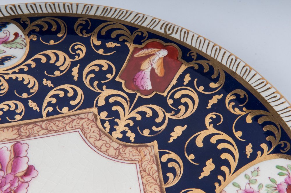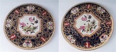 Lotto di due piatti da parete in porcellana policromaa tutto fondo con piede da appoggio ad anello ribassato. I piatti sono centrati da una riserva a decoro floreale con peonie su fondo bianco. Intorno su fondo blu decoro in oro a rami e foglie con piccole riserve con personaggi e fiori.
