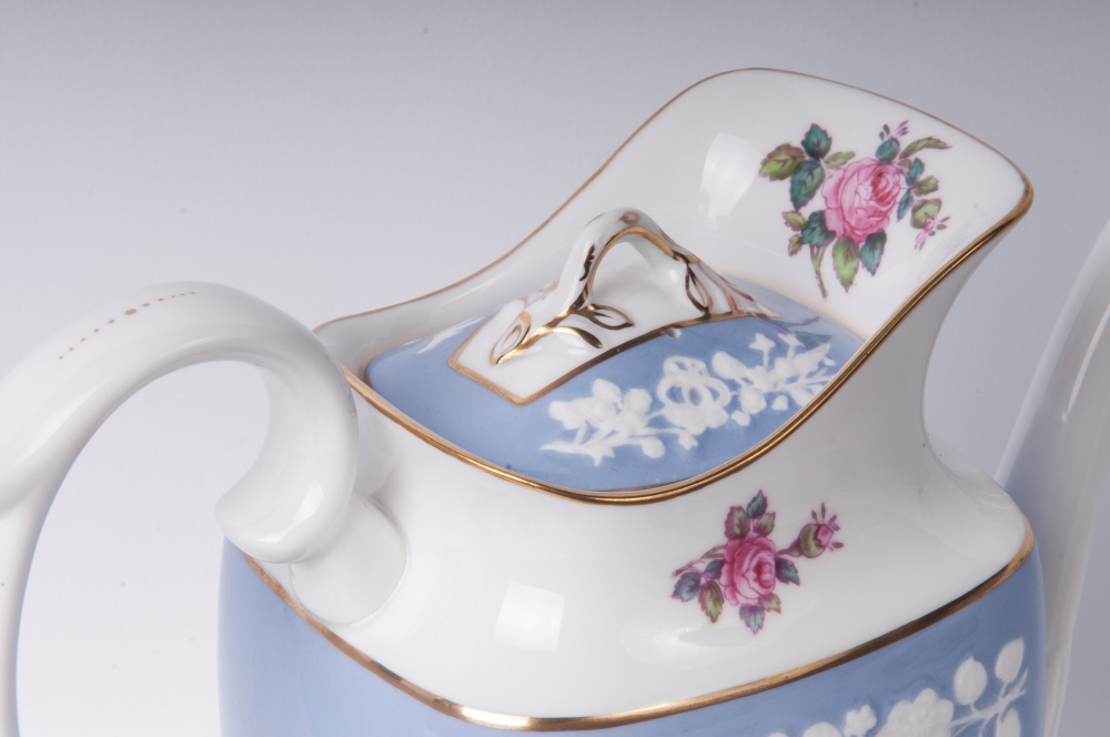 Servizio da caffè in porcellana policromacon decoro floreale alla rosa e rametti con fiorellini alla barbotina bianca, finiture in oro zecchino. Composto da tre pezzi in forma: caffettiera 21 x 6,5 x 8 cm:; lattiera 7,5 x 6 x 4,5 cm; zuccheriera 8 x 7,5 x 5,5 cm
