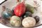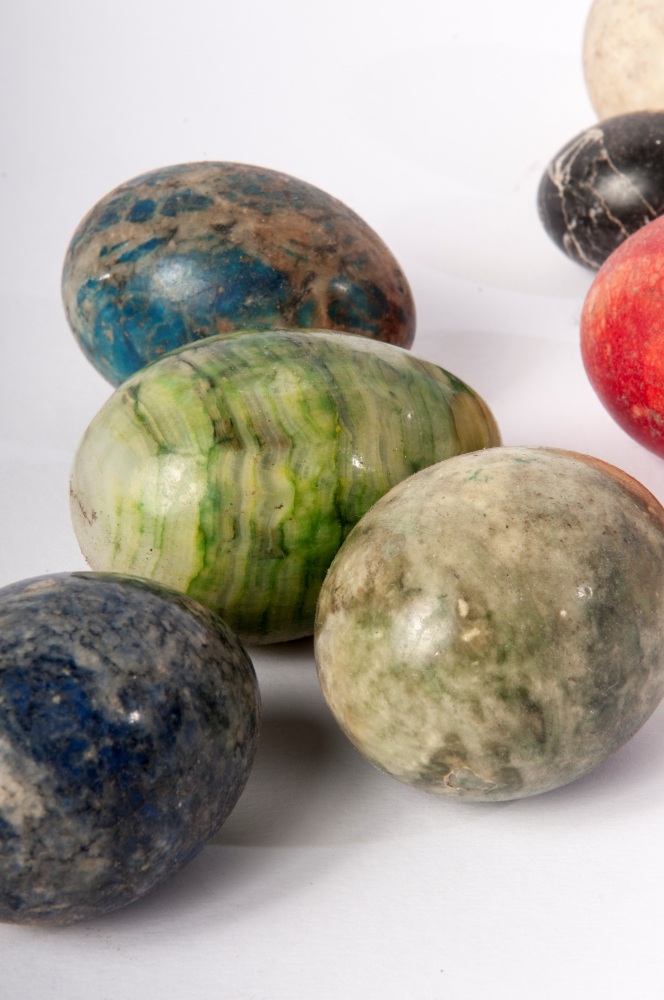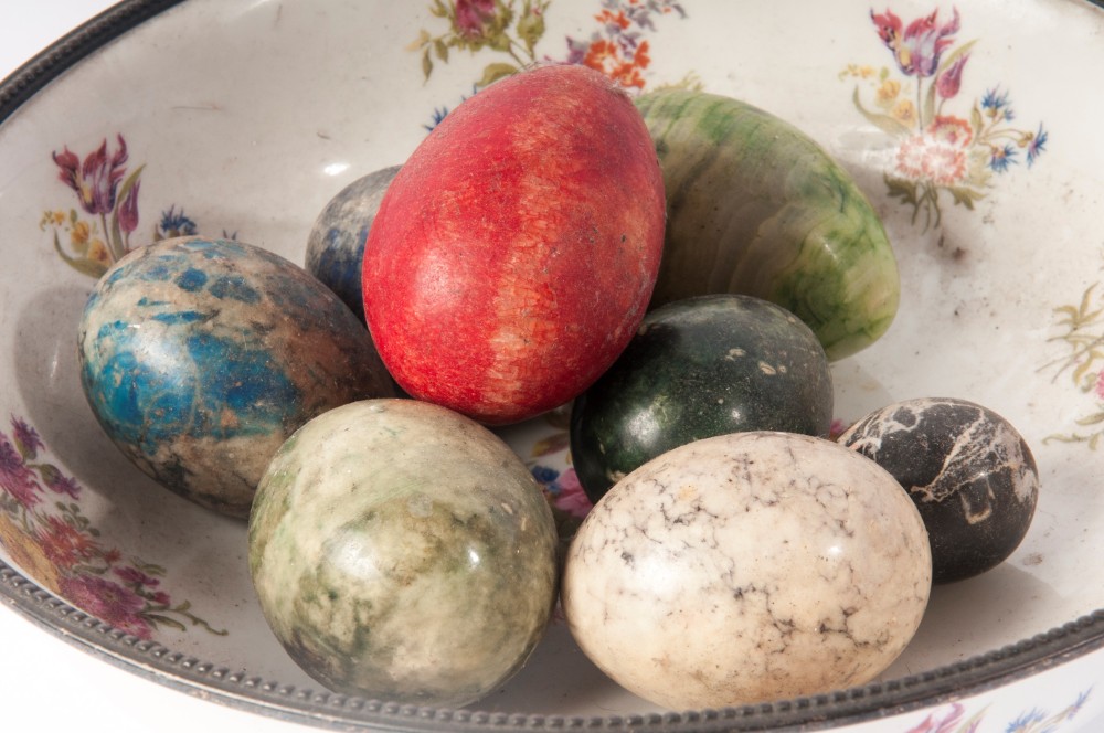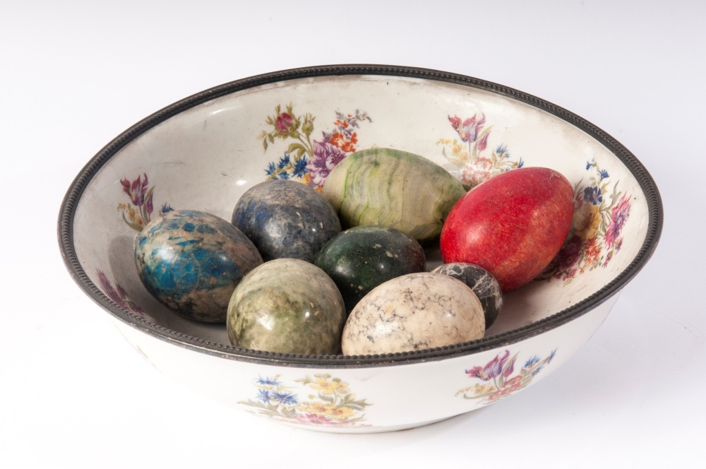 Vasca in porcellana policroma con decoro floreale su fondo bianco e con otto uova in materiale lapideo di dimensioni differente.