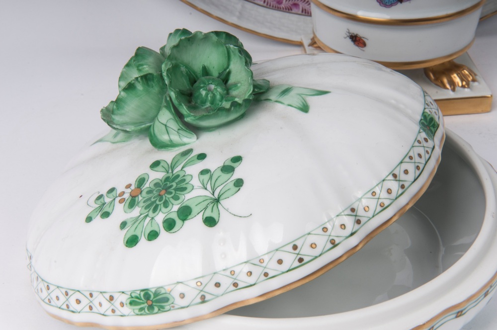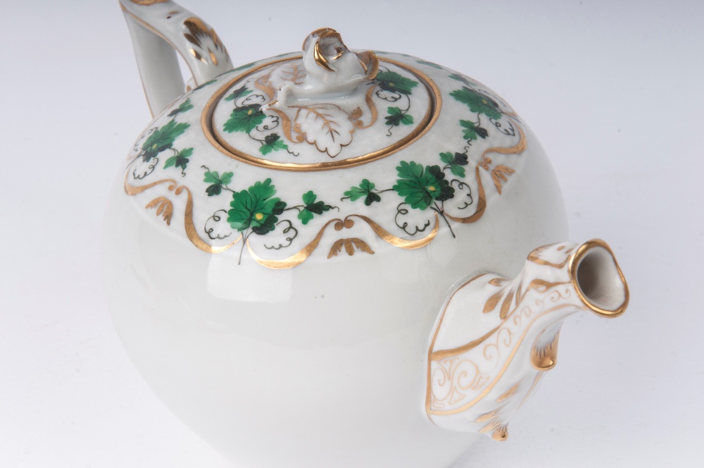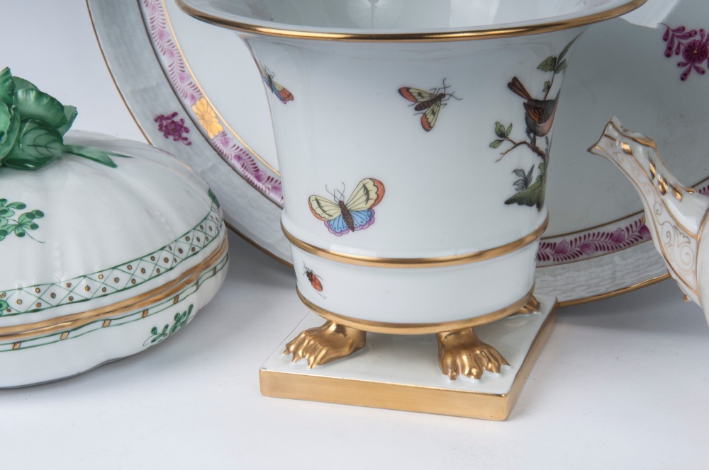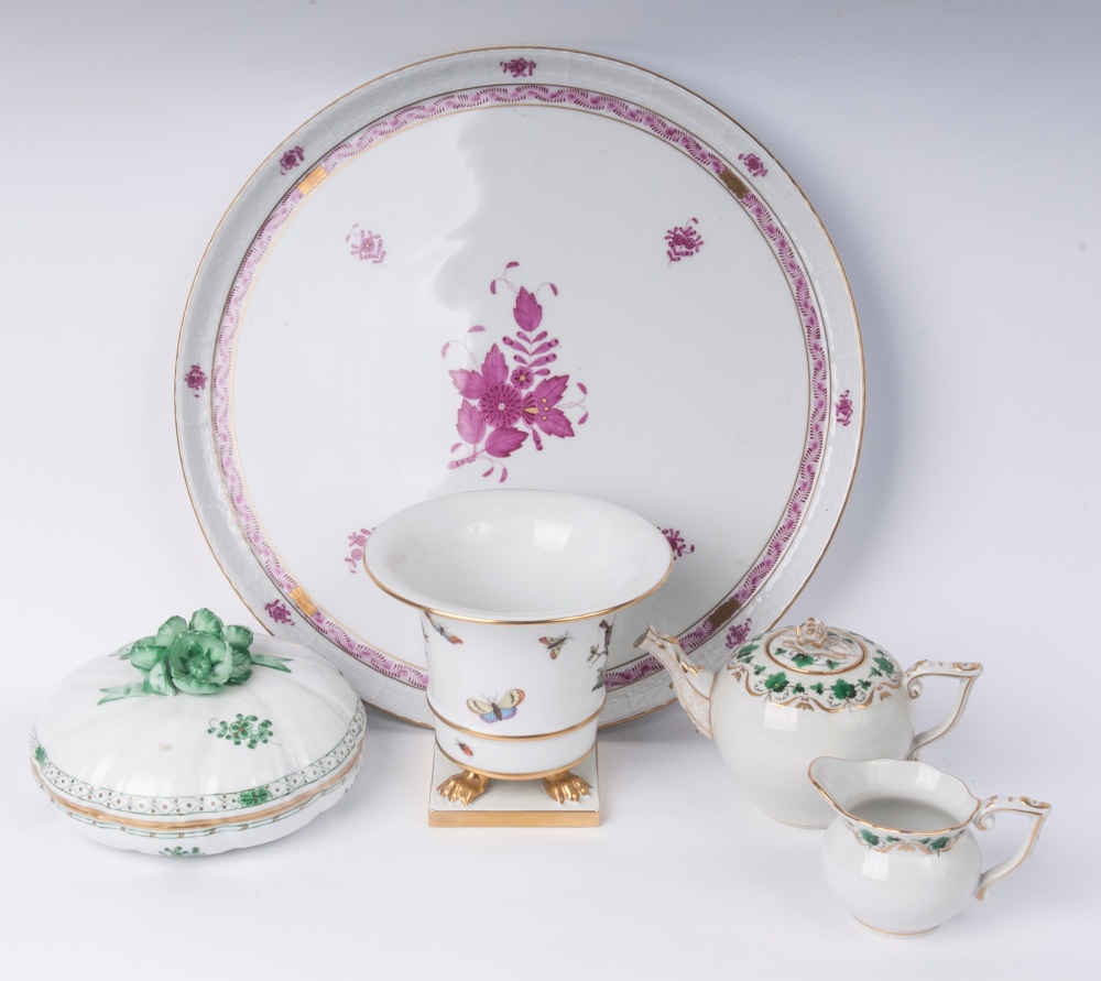 Lotto di cinque porcellane policromecomposto da: una lattiera, una caffettiera , un scatola, un vaso a tromba con quattro piedini ed un vassoio. Dimensioni differenti con decoro floreale ed a insetti con finiture in oro zecchino su fondo bianco.
