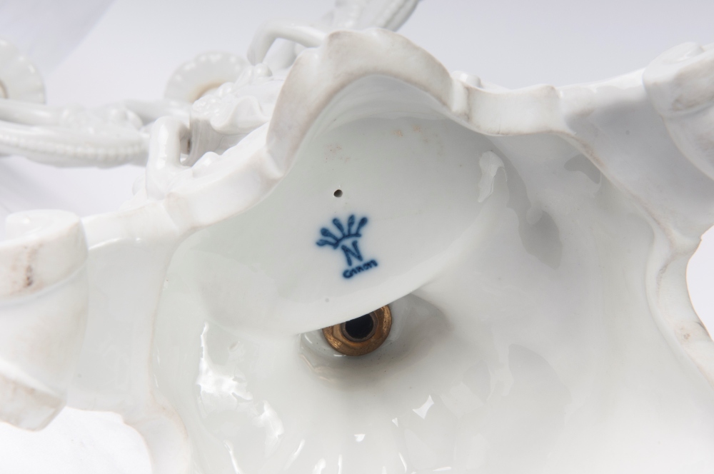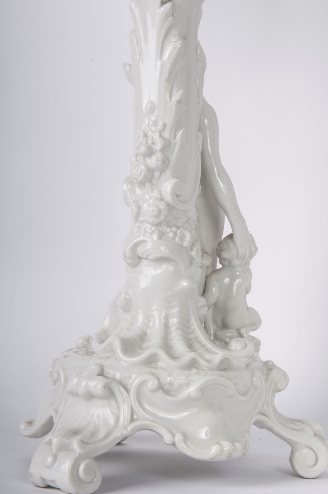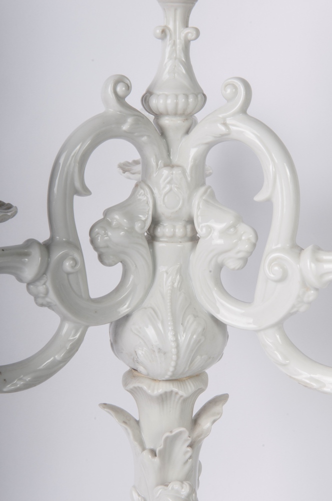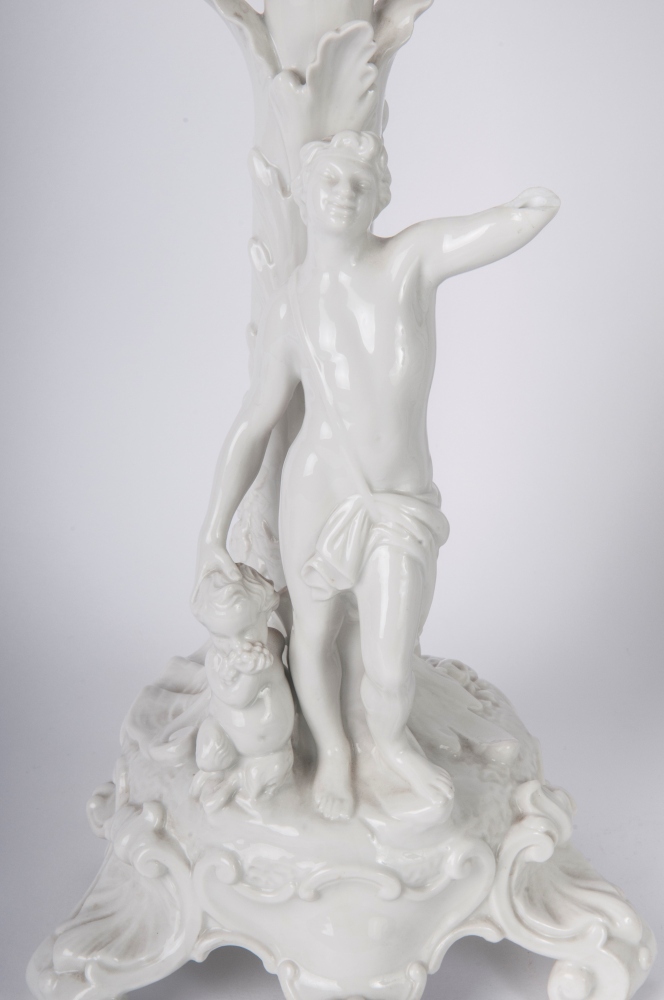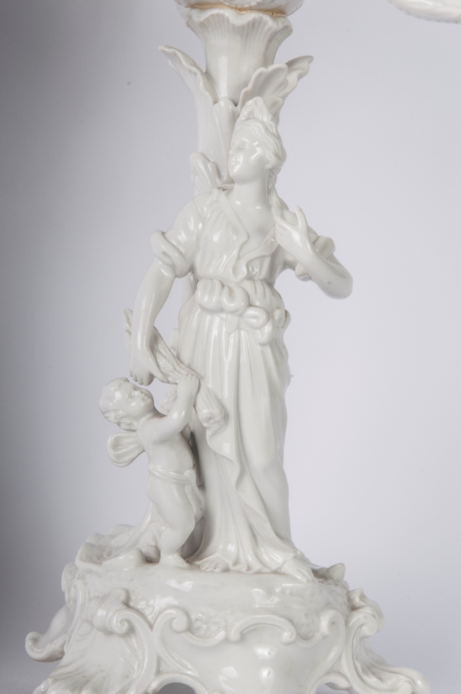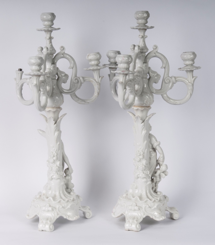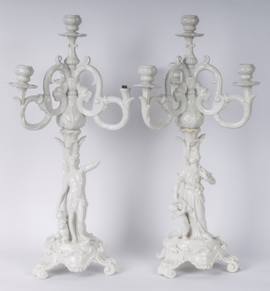 Coppia di candelabri a quattro luciin porcellana di gusto Barocco in monocromia bianca con base e rocailles accompagnate da personaggi maschili e femminili con satiro e putto. Manifattura Ginori, prima metà XX secolo
