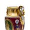Coppia vasi,in porcellana policroma, corpo ad urna che termina con piede tondo perlinato su base quadrata. Collo ad imbuto con coppia di prese a cigno. Decorazioni a riserve su fondo rosso con profili mulieri e festoni di frutta. Collo, piede e finiture in oro zecchino.