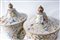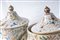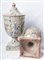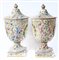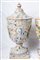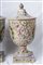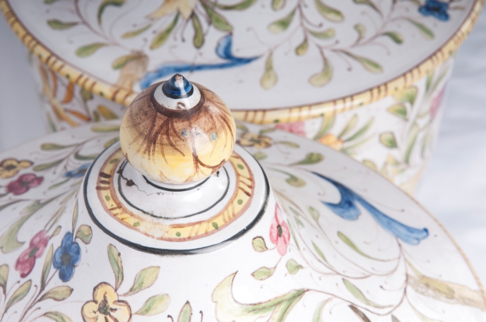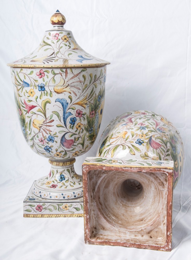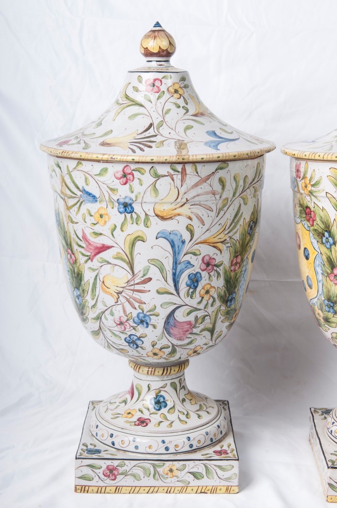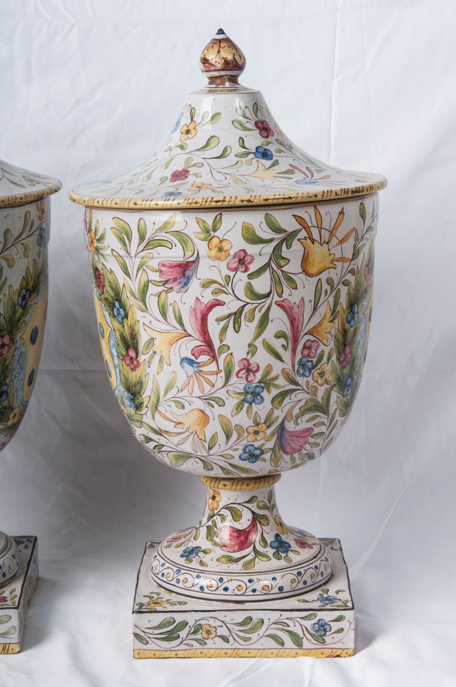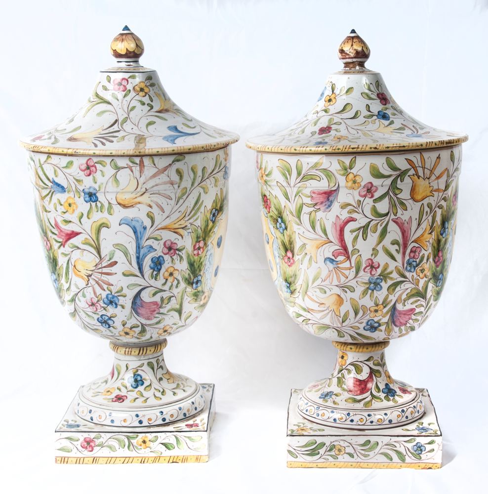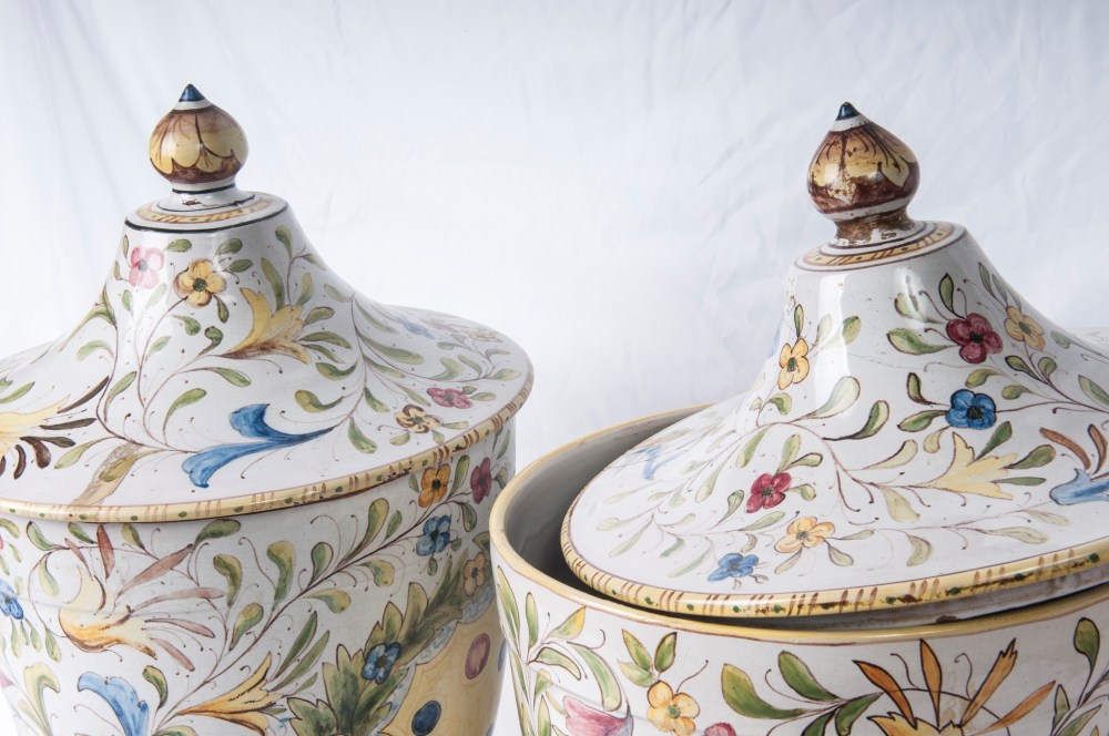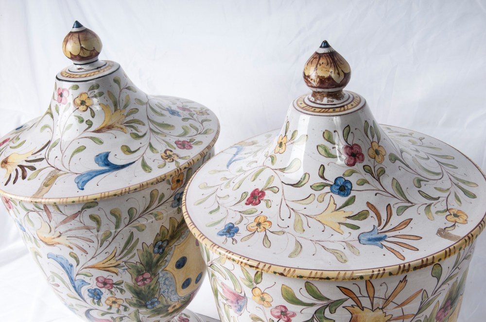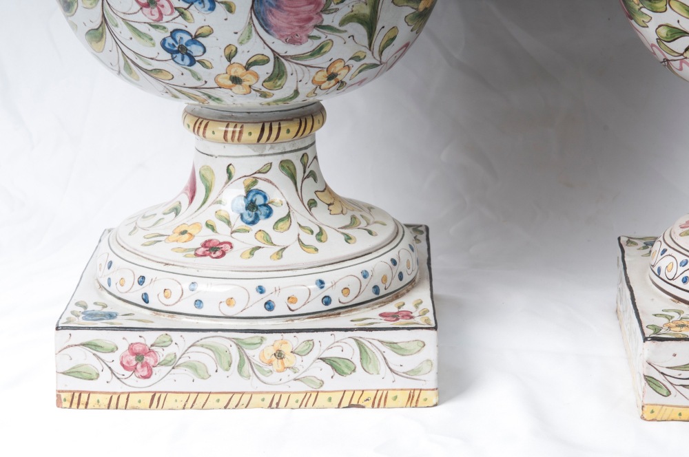 Coppia di vasi in ceramica ad urnadecoro floreale su fondo bianco e stemma mediceo entro riserva. Manifattura probabilmente Deruta, metà XX secolo