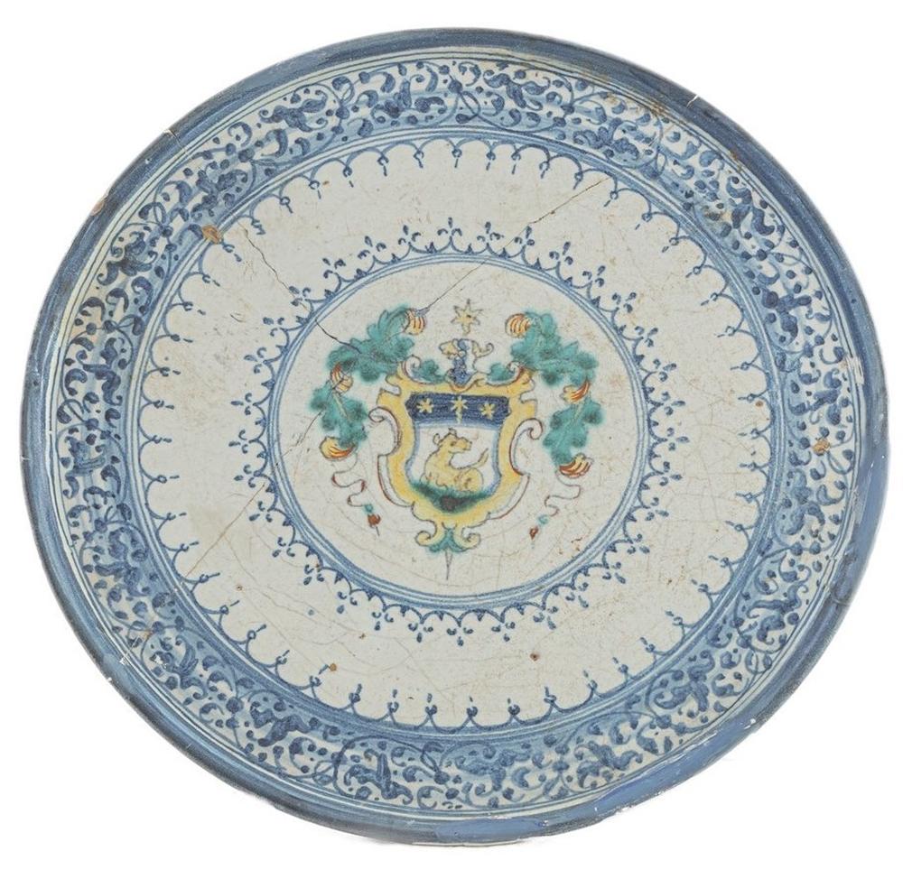Con corto piede che sorregge un ampio piatto dall'orlo rialzato. Decoro blu a graticcio di foglie con al centro blasone nobiliare, su fondo bianco.