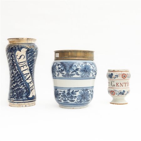 lotto di tre albarelli in ceramica bianca e blu ITALIA, XVIII secolo
