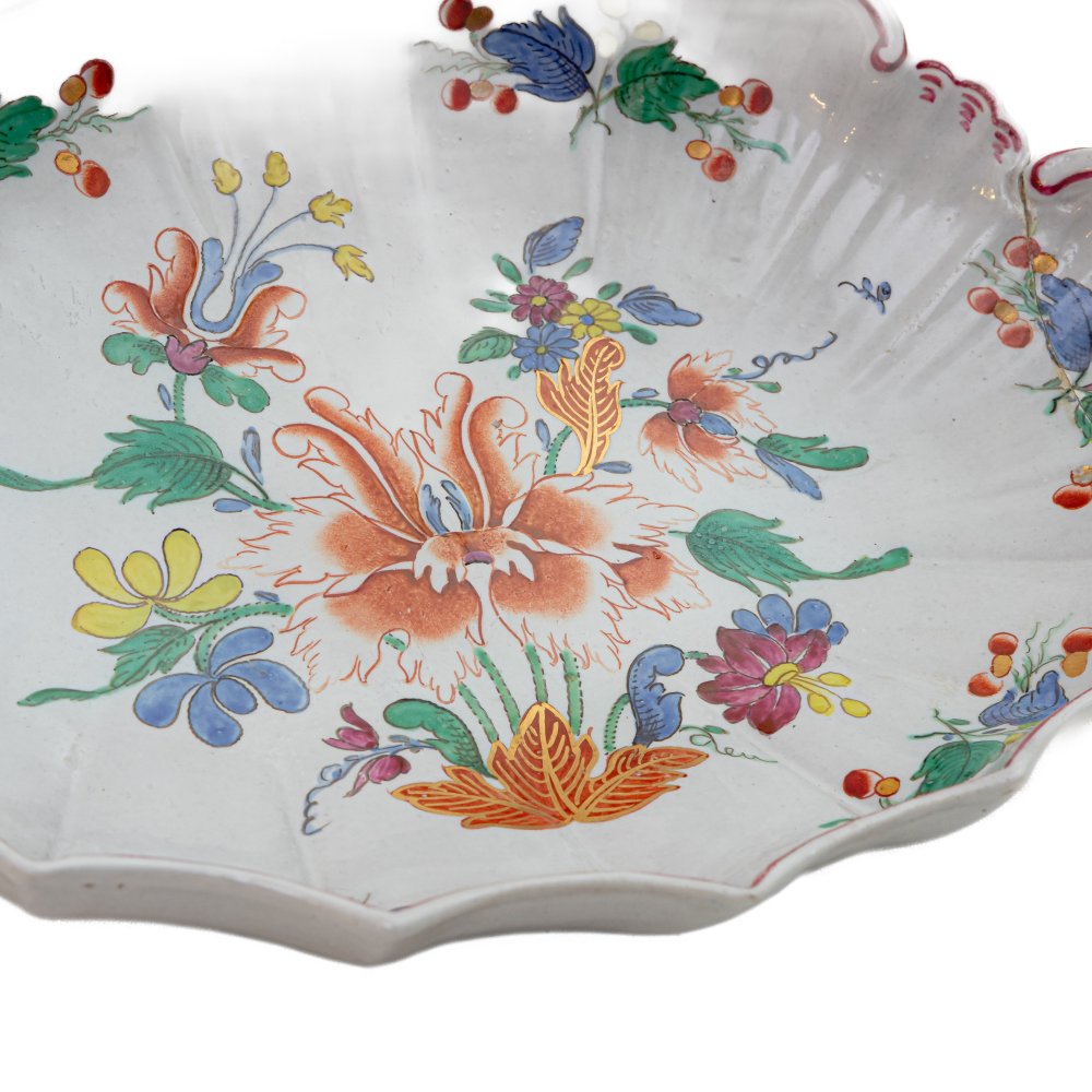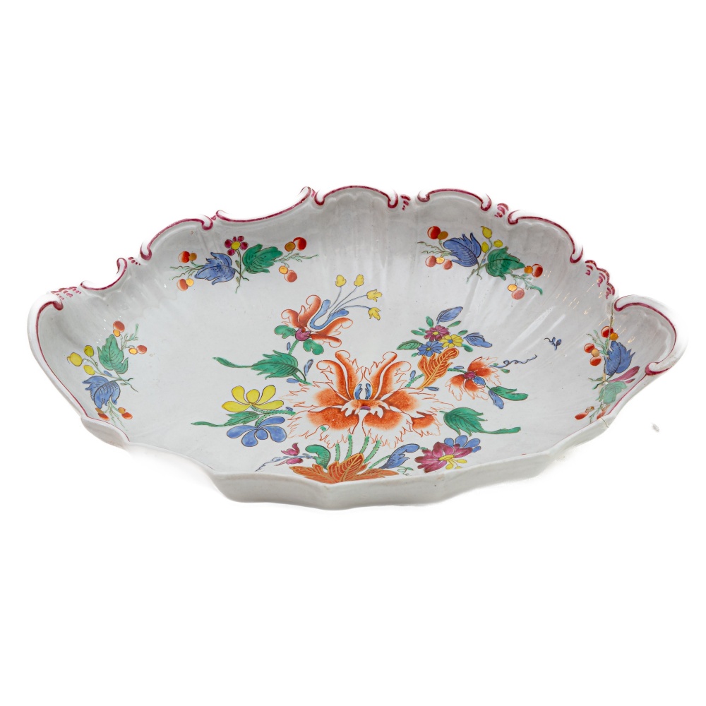 Forma ellittica, dal bordo mistilineo con lati lunghi rialzati a conchiglia, bordi leggermente costolati e rastremati verso il basso, retro a fondo ribassato. Decoro a" tulipano" con infiorescenze e racemi sparsi, finiture in oro zecchino.