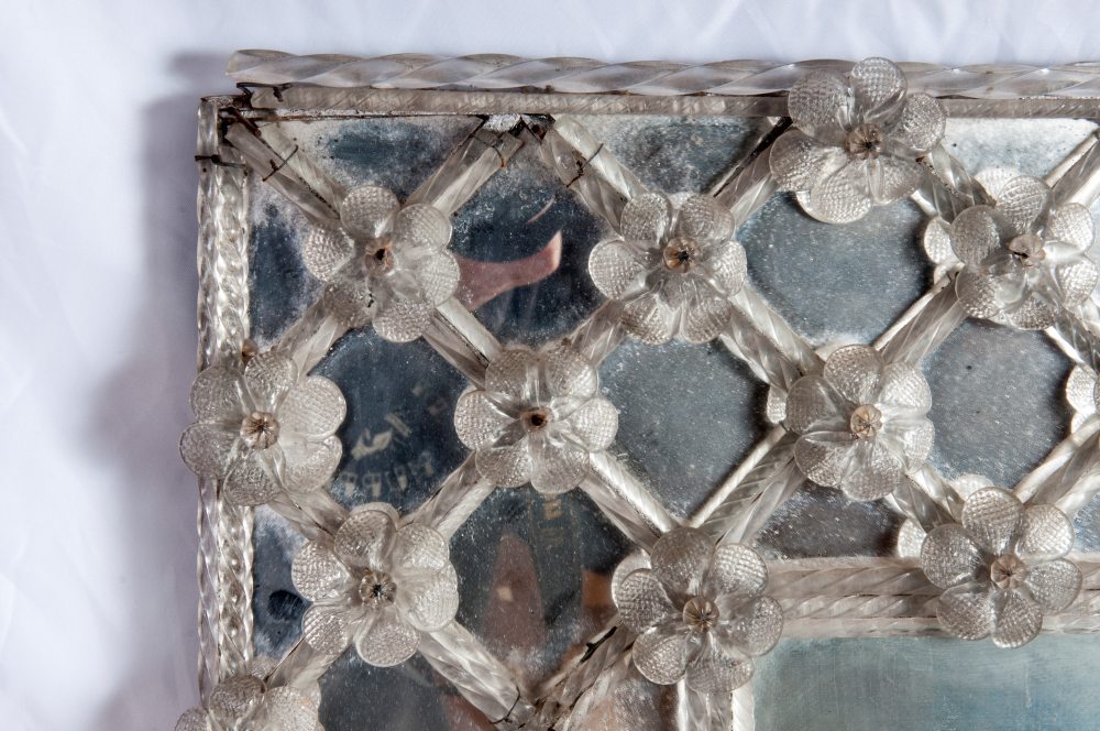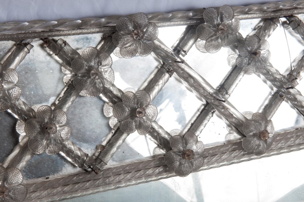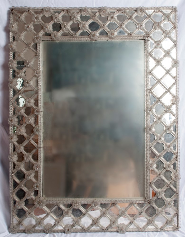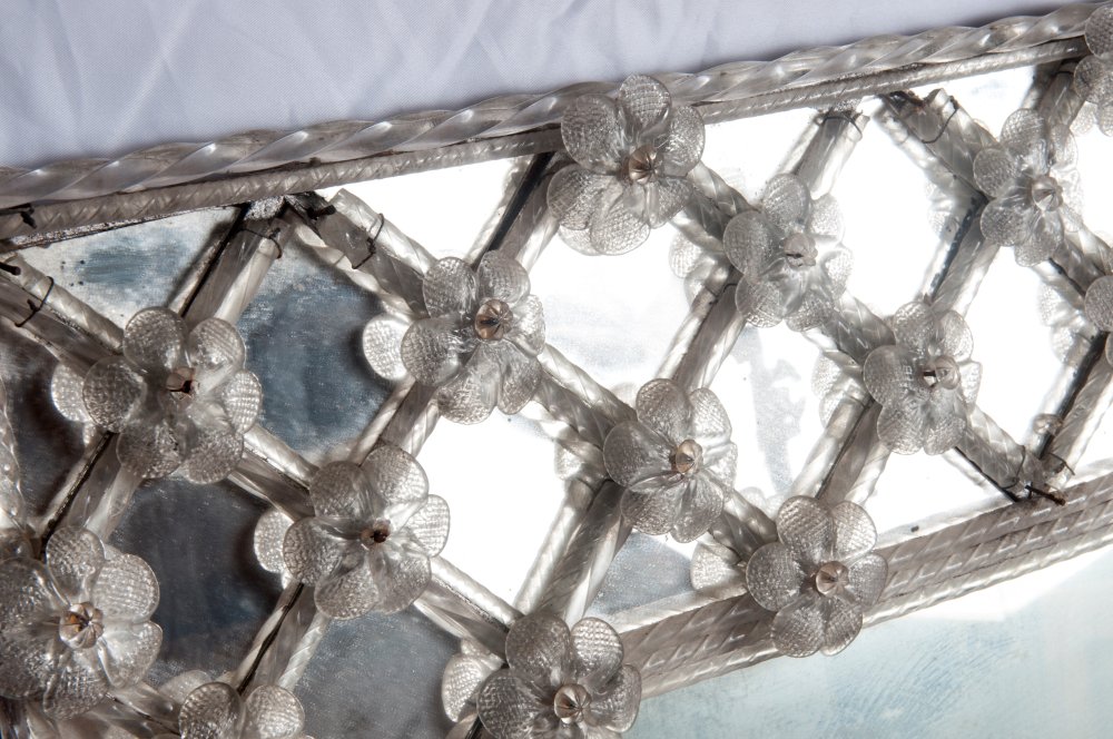 Specchiera in vetro di Muranodi forma rettangolare con cornice in vetro a rombi e fiorellini.