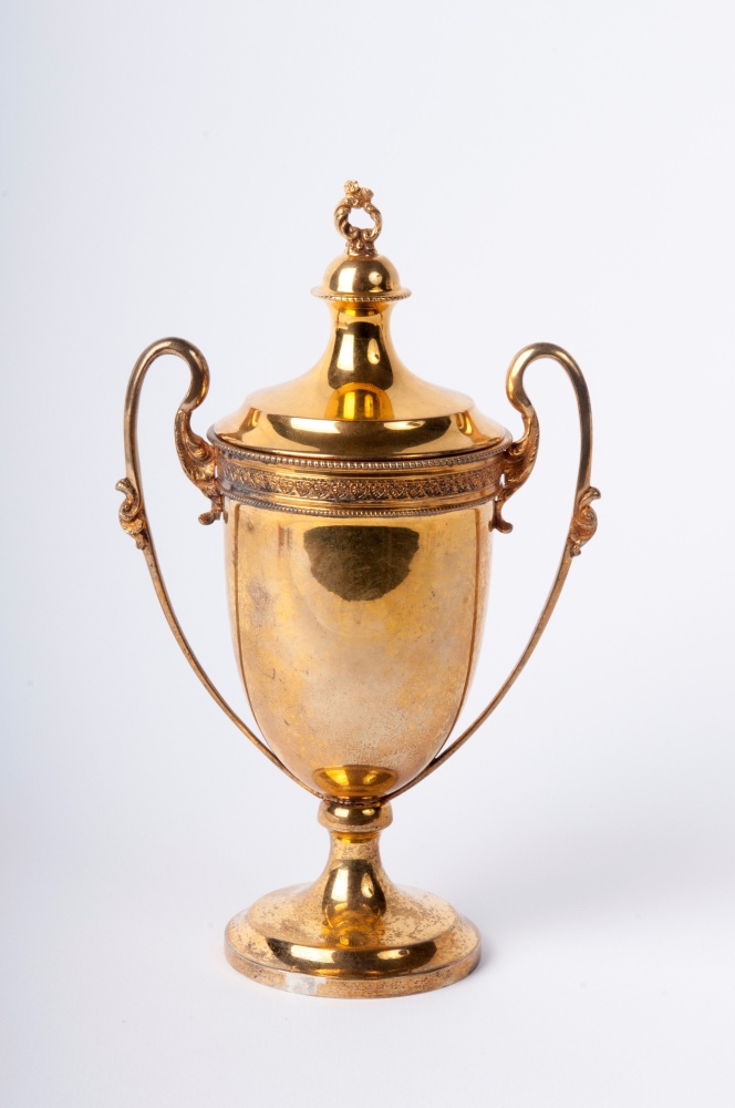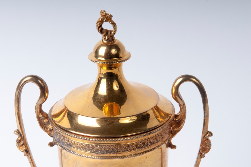 Coppa in argento vermeil 800/1000impugnature ad ansa con innesto a fiori e coperchio con presa a riccio. Gr 337, punzonatura italiana in parte cancellata di difficile lettura.