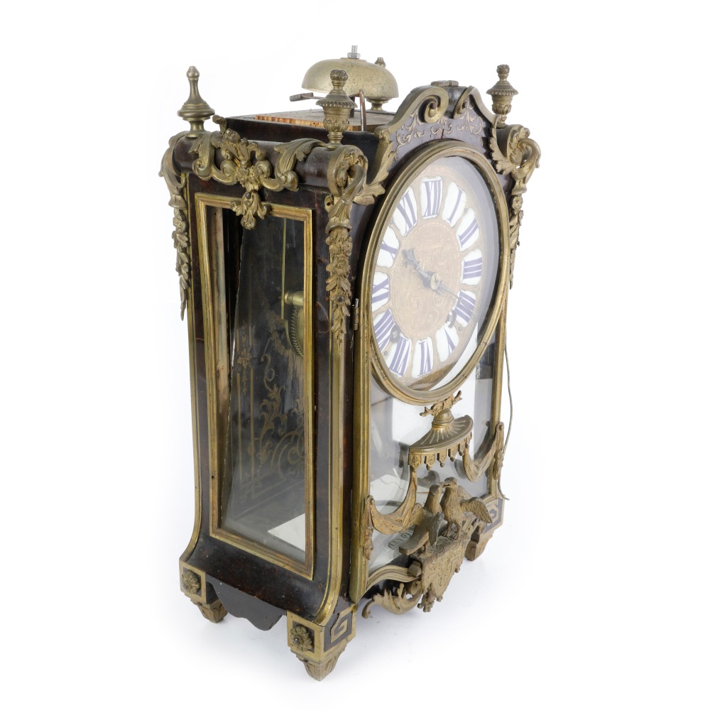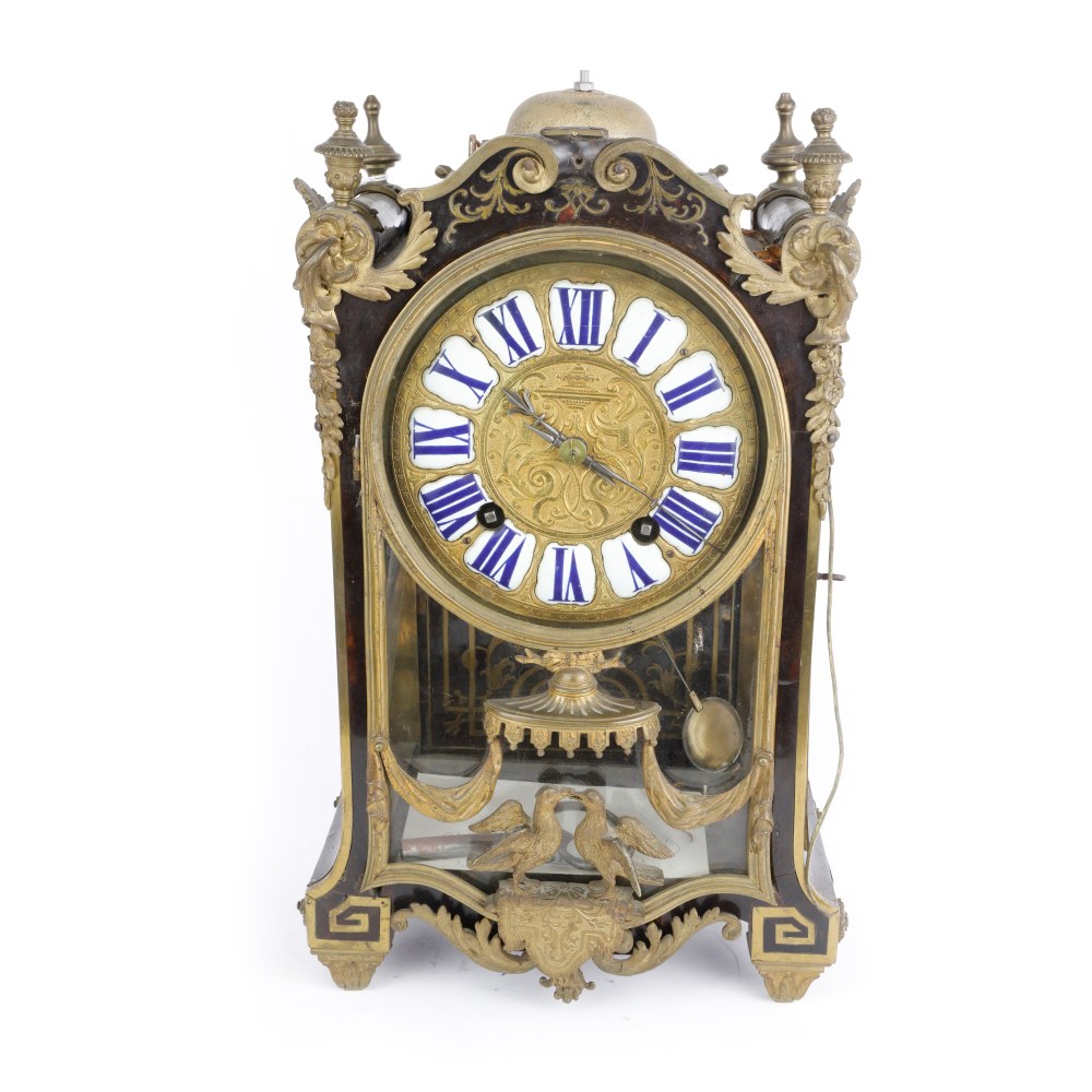 con quadrante circolare in bronzo dorato ed inciso a rilievi floreali, con numeri romani in blu su smalto bianco e numeri arabi sul bordo esterno, presenta due fori per la carica e la suoneria. Movimento con sospensione a filo e regolatore a pendolo ; suoneria a percussione con campana in bronzo, macchina firmata Gite Martinot aparis. Cassa a plinto su quattro piedi tronco conici , con pareti laterali in vetro e legno impiallacciato e filettato in ottone.