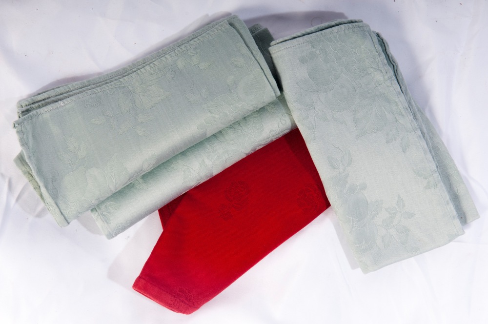 Lotto di quattordici tovaglieda tavola in cotone a diversi colori come segue: due gialle a decoro floreale diametro 320 cm; una bianca a decoro floreale 748 x 312 cm con 40 tovaglioli; tre bianche tonda a decoro floreale diametro 320 cm; una verde acqua con decoro floreale 528 x 182 cm con 11 tovaglioli; una rossa con decori in oro 140 x 140 cm con 12 tovaglioli; una arancione 280 x 172 cm con 12 tovaglioli; una bianca a decoro floreale 176 x 165 cm con 6 tovaglioli; una gialla 312 x 748 cm con 40 tovaglioli; una arancione e rosso 170 x 290 cm; una gialla e rossa con decoro ad api 280 x 170 con 12 tovaglioli; una bianca con decoro floreale diametro 320 cm.