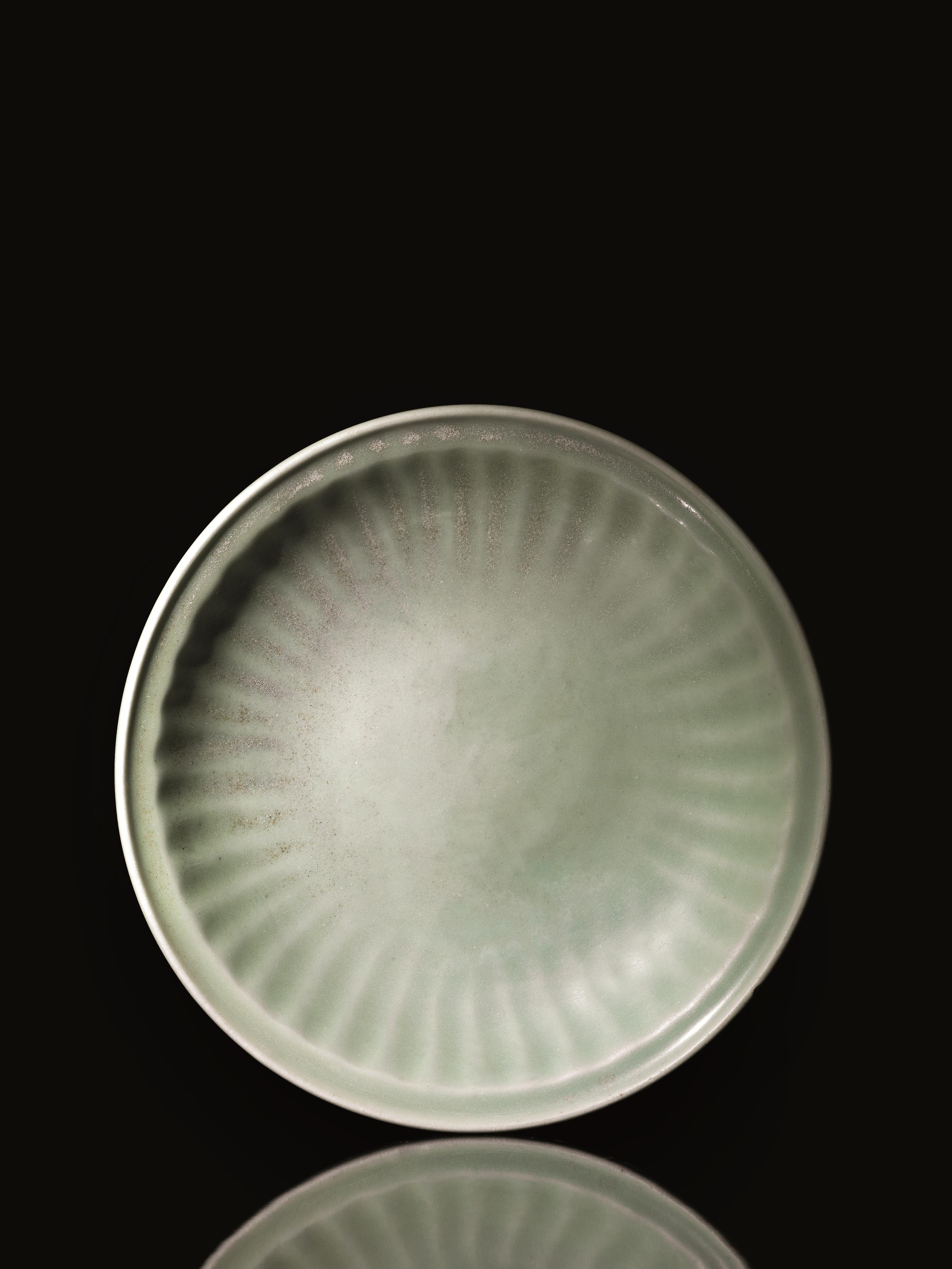 in porcellana celadon, con decoro centrale floreale e baccellature sul bordo del piatto, diam. cm 34