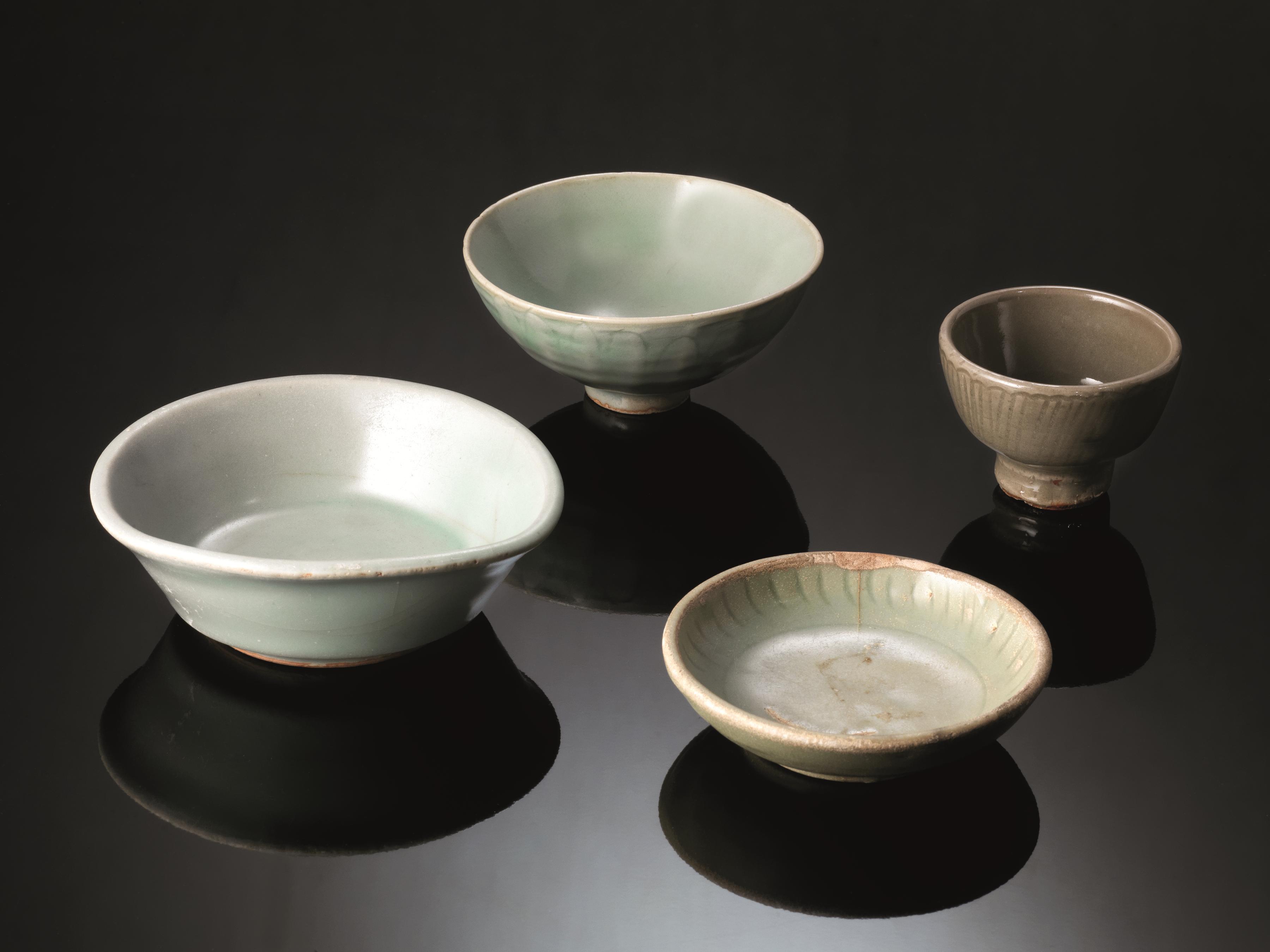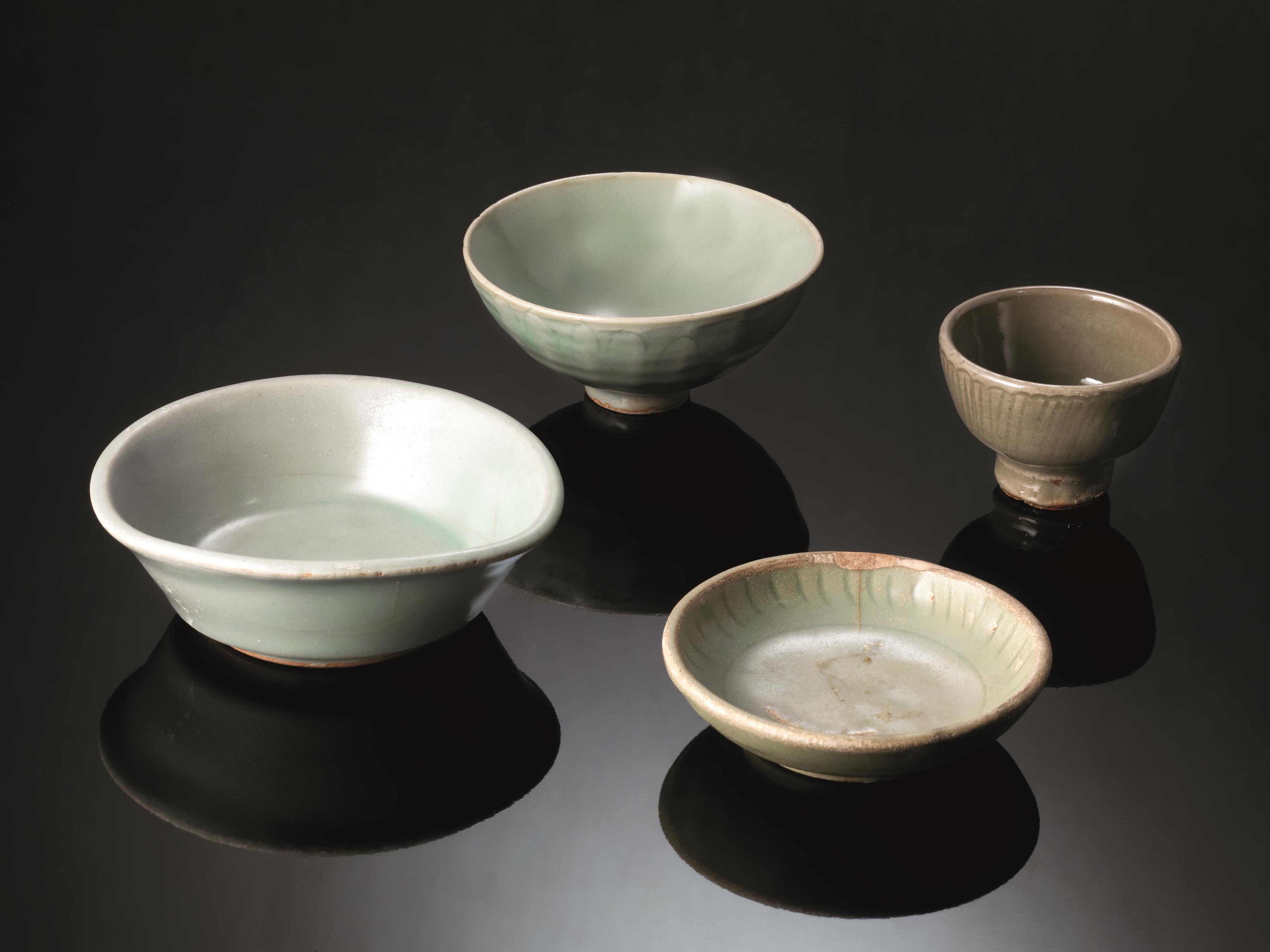 DUE COPPETTE E DUE PIATTINI, CINA, DINASTIA MINGin porcellana celadon, le...