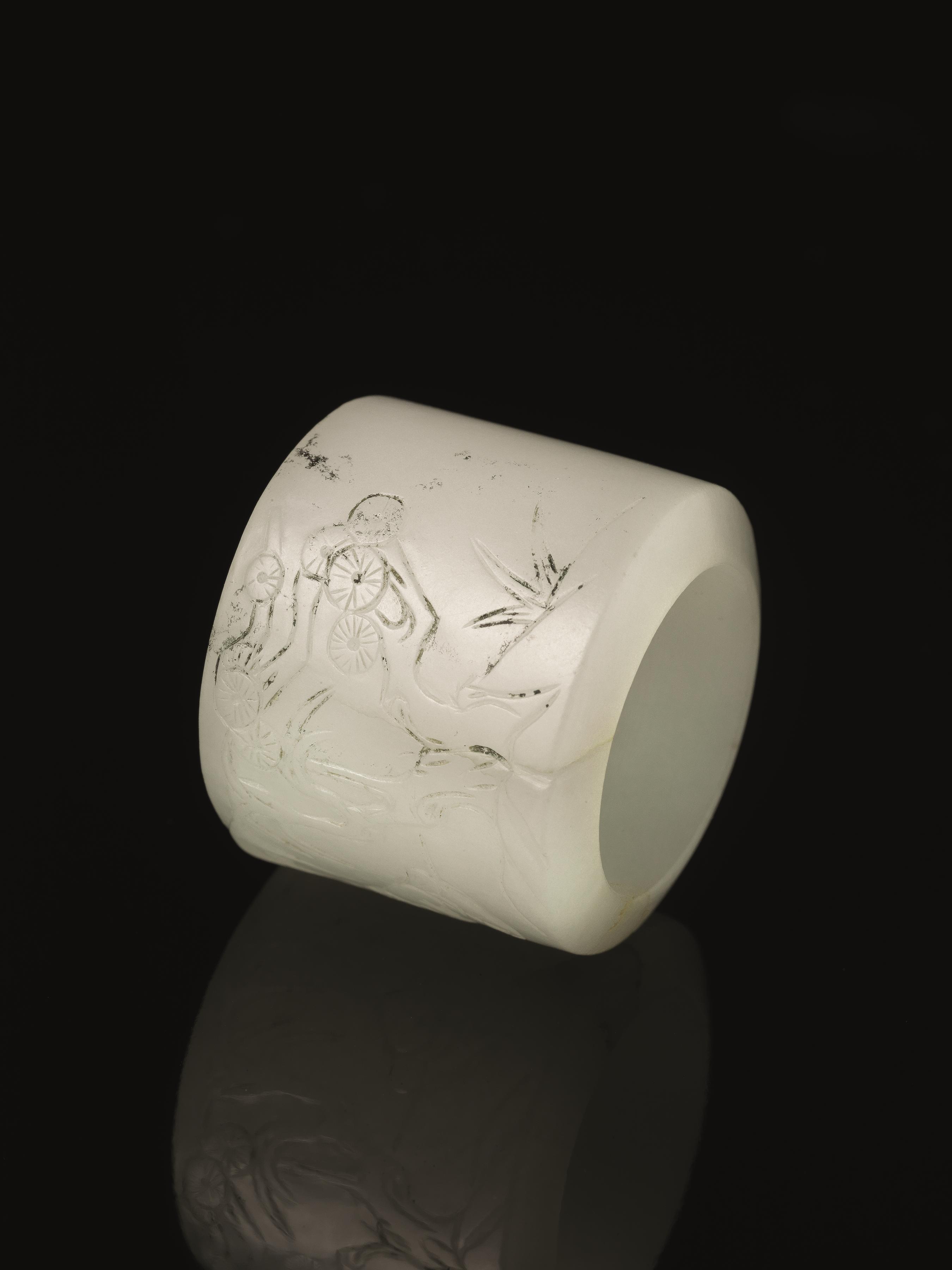 ANELLO DA ARCIERE, CINA, SECC. XIX-XXin giada bianca, inciso con figura in un...