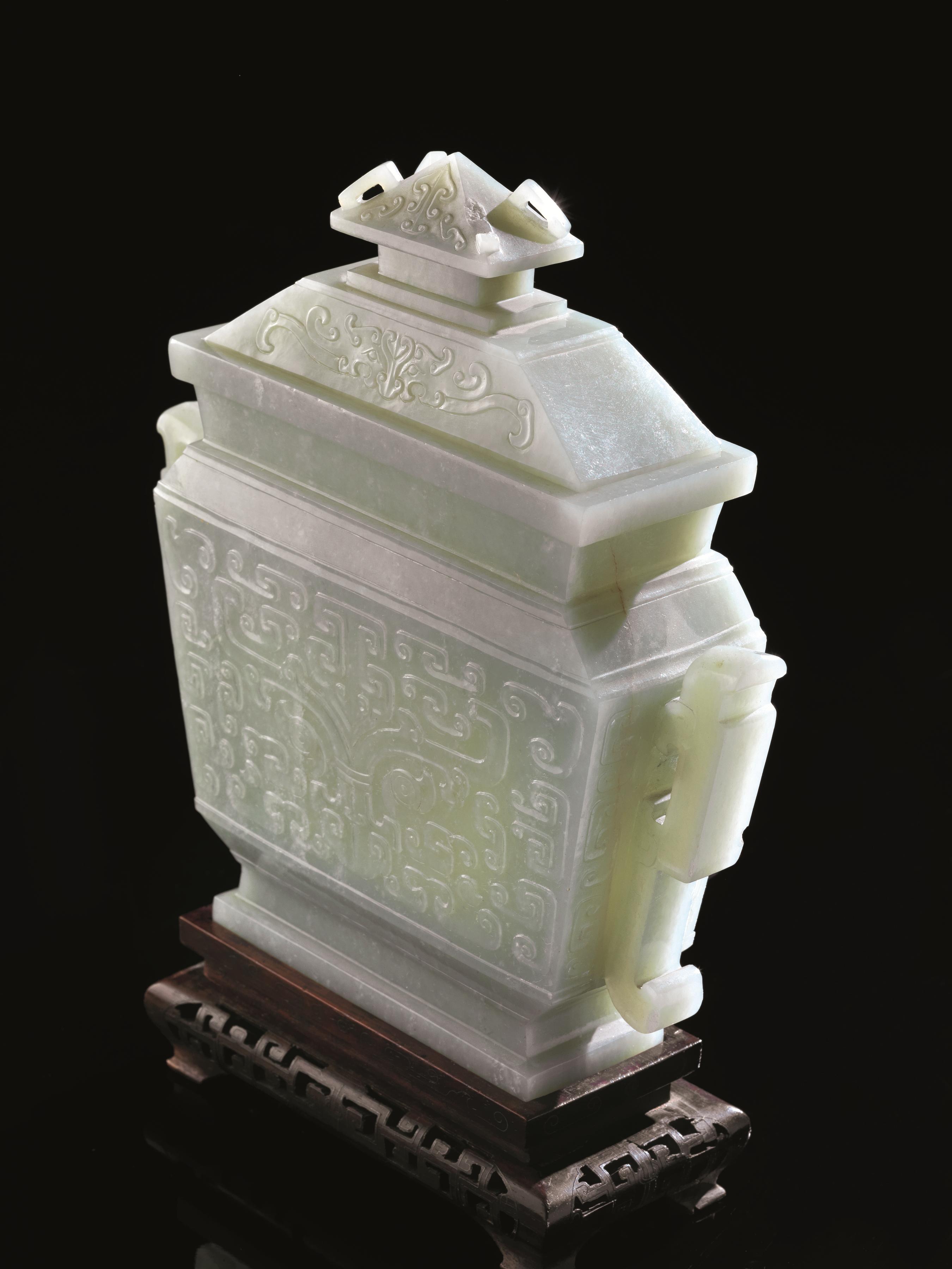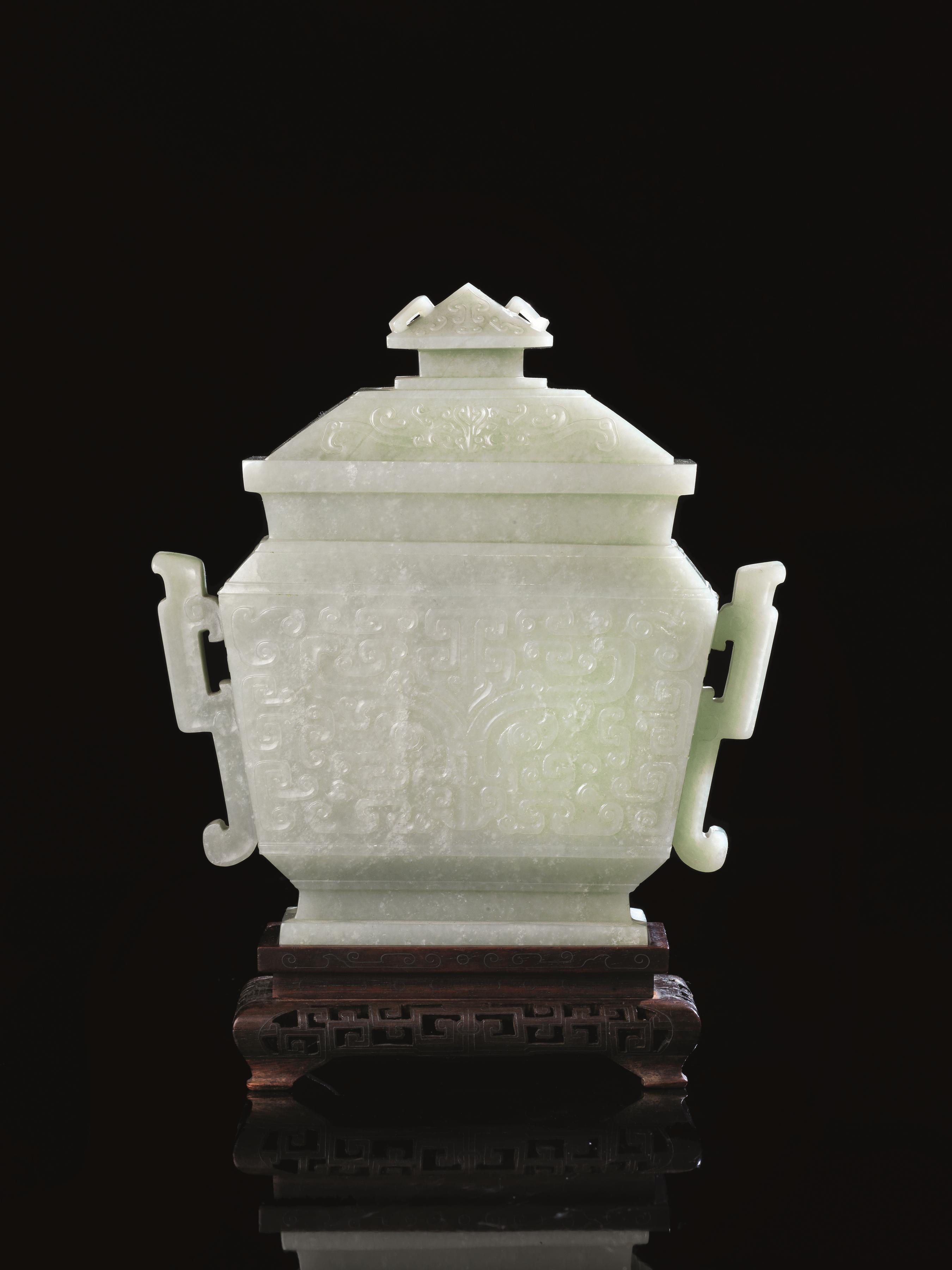 in giada verde celadon, modellato nella forma di antico bronzo rituale, con coperchio decorato con motivo taotie a rilievo, alt. cm 20,5, poggiante su base in legno