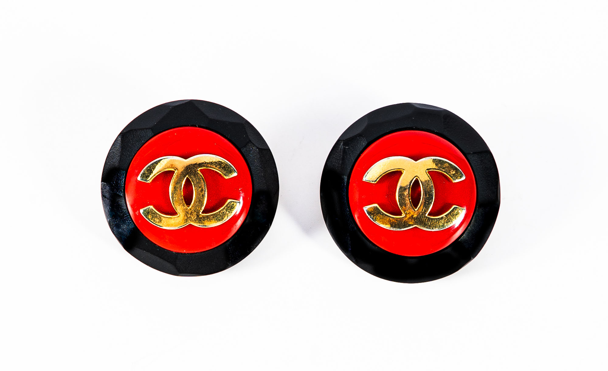CHANELOrecchini a clipAnni '80, Collezione n.23In resina nera e rossa e metallo dorato4 x 4 cmCon scatolaLievi segni di uso