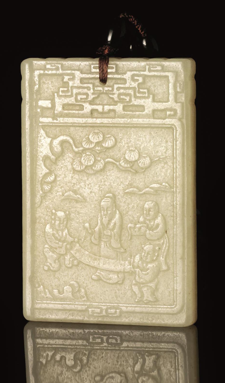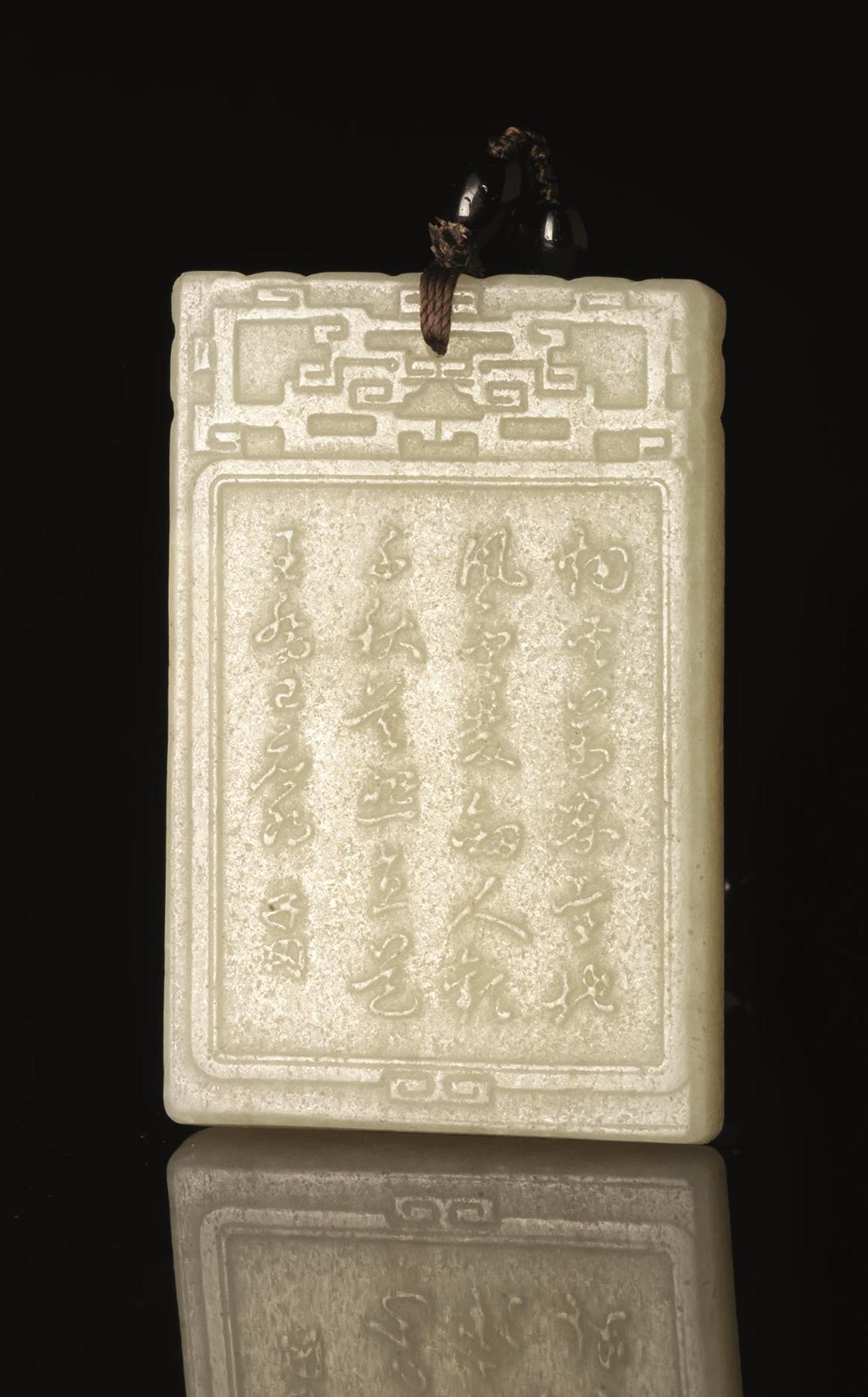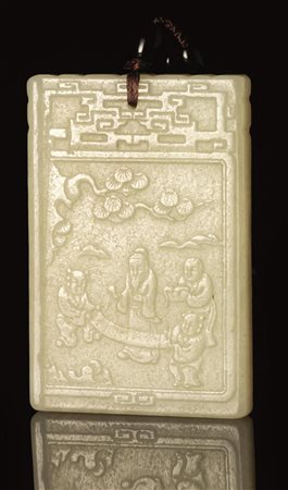 in giada celadon, forma rettangolare, decorato da un lato con figure di letterati sotto un albero, dall'altro con ideogrammi, alt. cm 5 ca