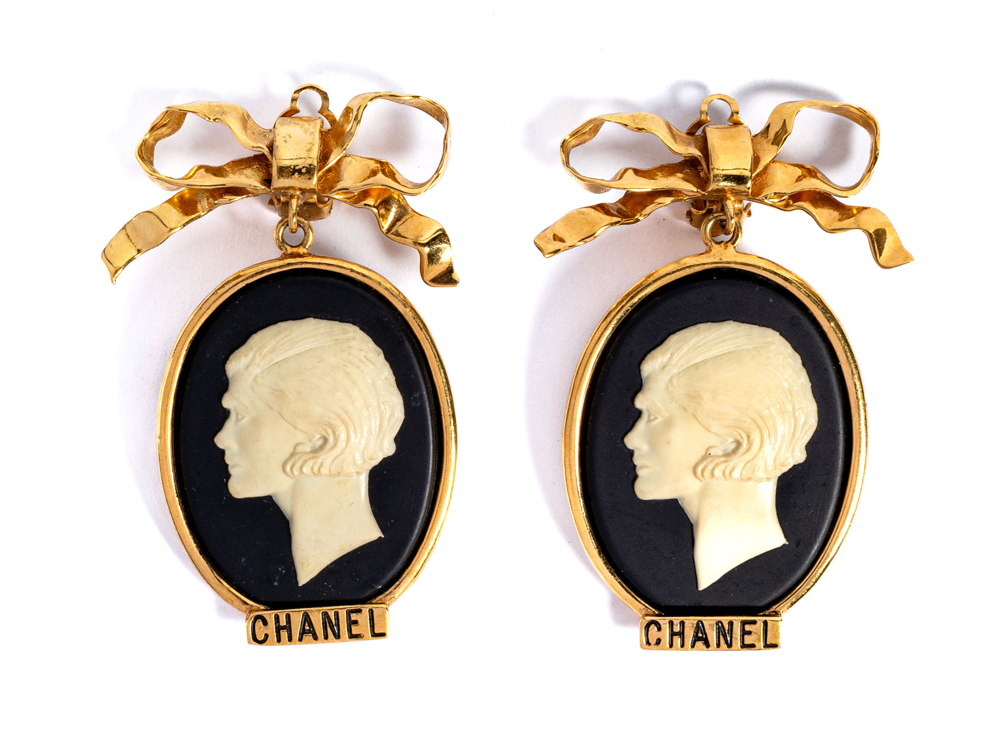 CHANELOrecchini a clip con pendente cammeoAnni '80In metallo dorato e resina8 x 4 cmCon scatolaIn buone condizioni