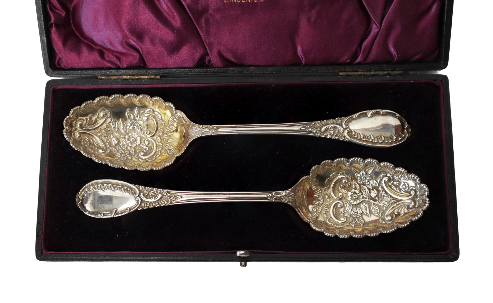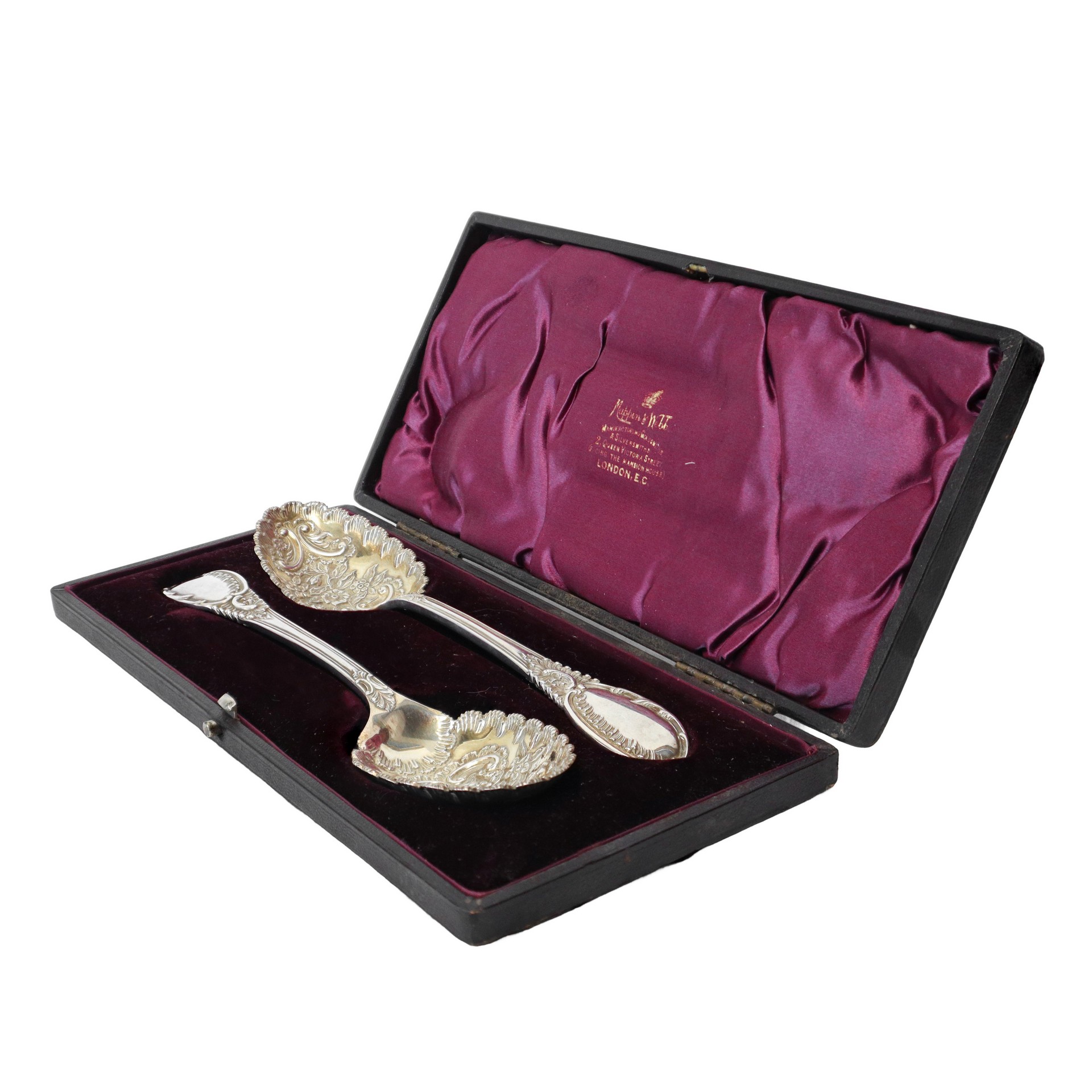 Mappin & Webb - Coppia di cucchiai da portata vittoriani decorati a sbalzo in sheffield inglese Punzoni sul manico. Dotati della scatola originale Punzoni sul manico. Dotati della scatola originale