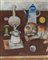 Franco Gentilini, Olio su tela sabbiata, 50x40 cm, Natura morta con gatto, 1978; Firmato e datato in basso al centro; Pubblicato sul Catalogo Generale alla pag. 695, n. 1627; Autentica dell'artista su foto; Collezioni: Roma, Galleria Tonelli. Esposizini: Tokyo, 1979, ill.; Parigi, 1980; Prato, 1980, ill. Bibliografia: A. Bosquet, 1979, pag. 20, tav. 30 (olio su tela)