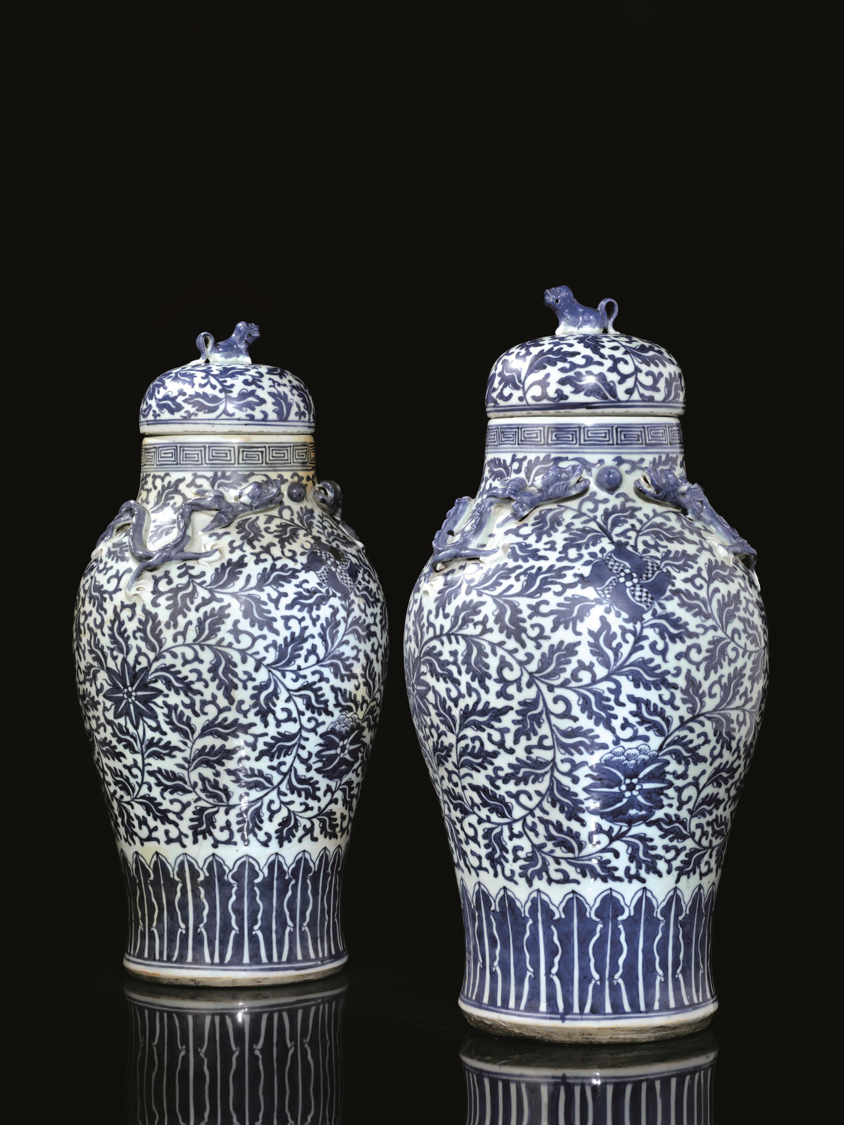 in porcellana bianca e blu, decorate con ramage, il collo dei vasi presenta due draghi a rilievo, alt. cm 50 (2)