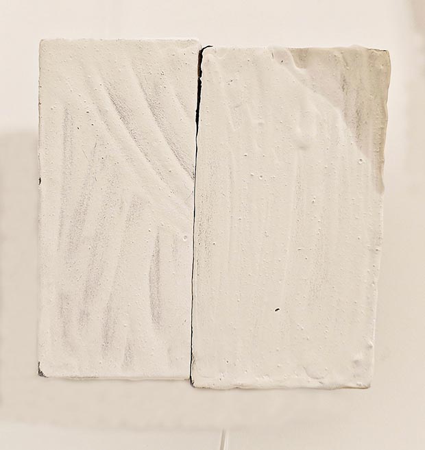 Enzo Cacciola, Cemento bianco su jeans, n. 23, 20x20 cm, Senza titolo, 2023; Autentica dell'artista su foto