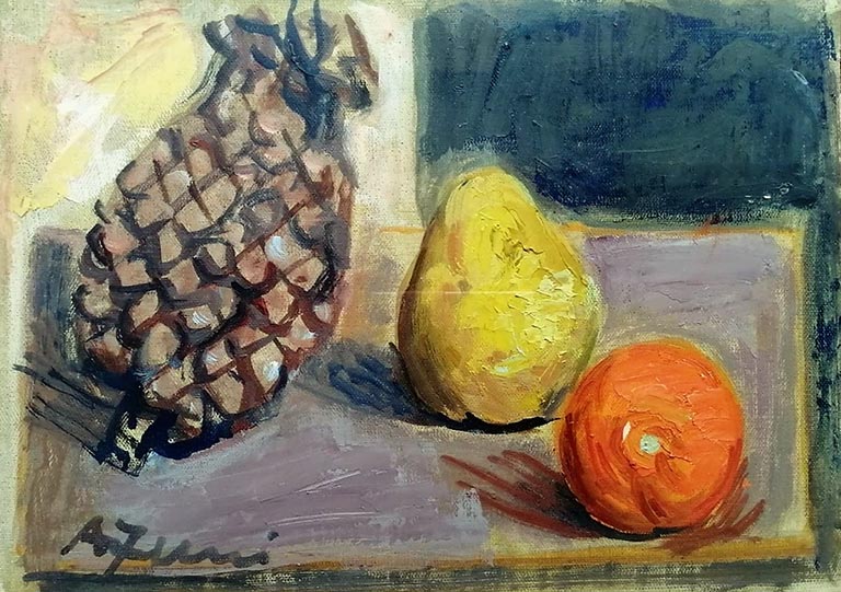 Achille Funi, Olio su tela, 25x35 cm, Natura morta, 1969; Firmato in basso a sinistra e sul retro