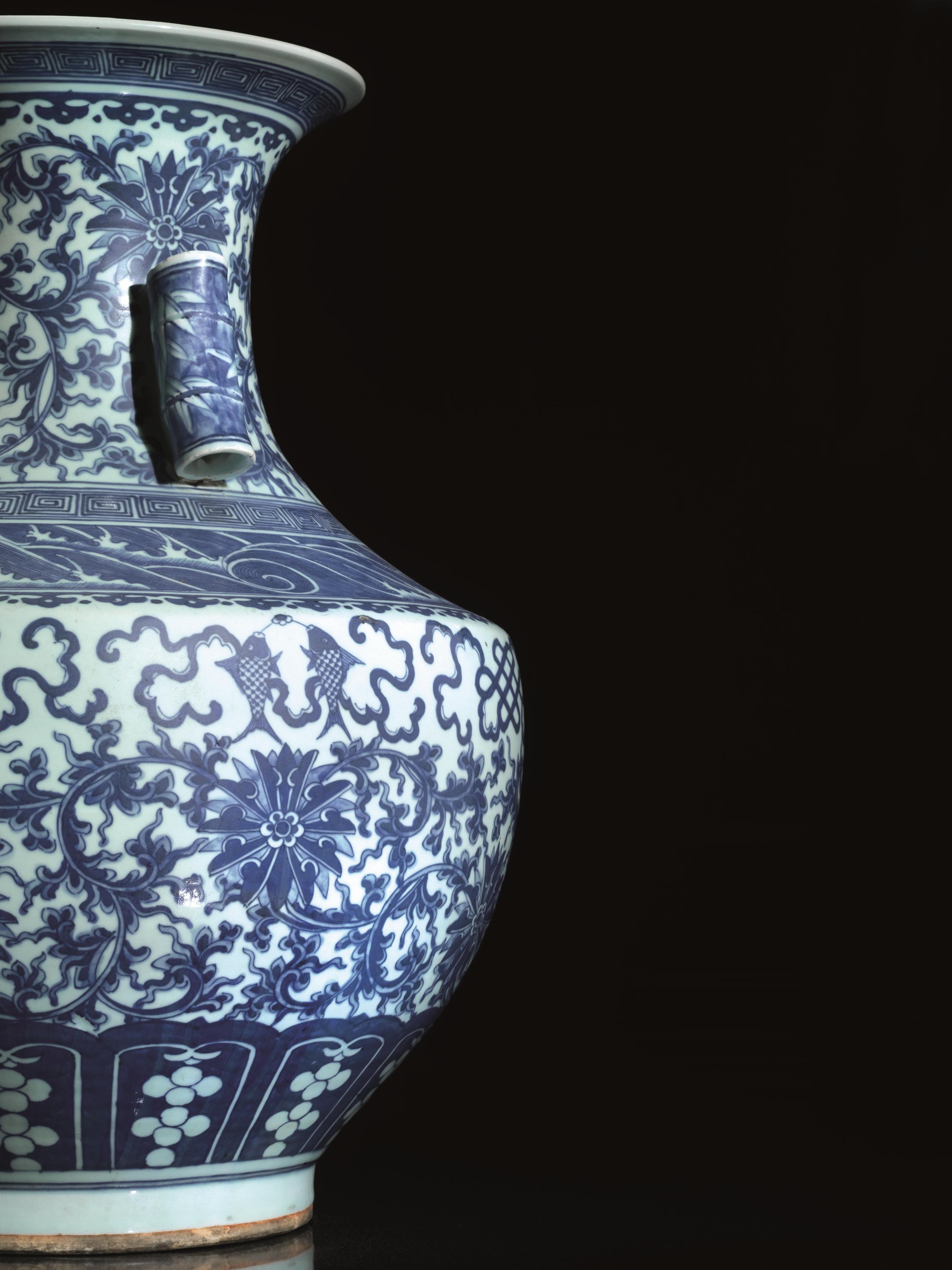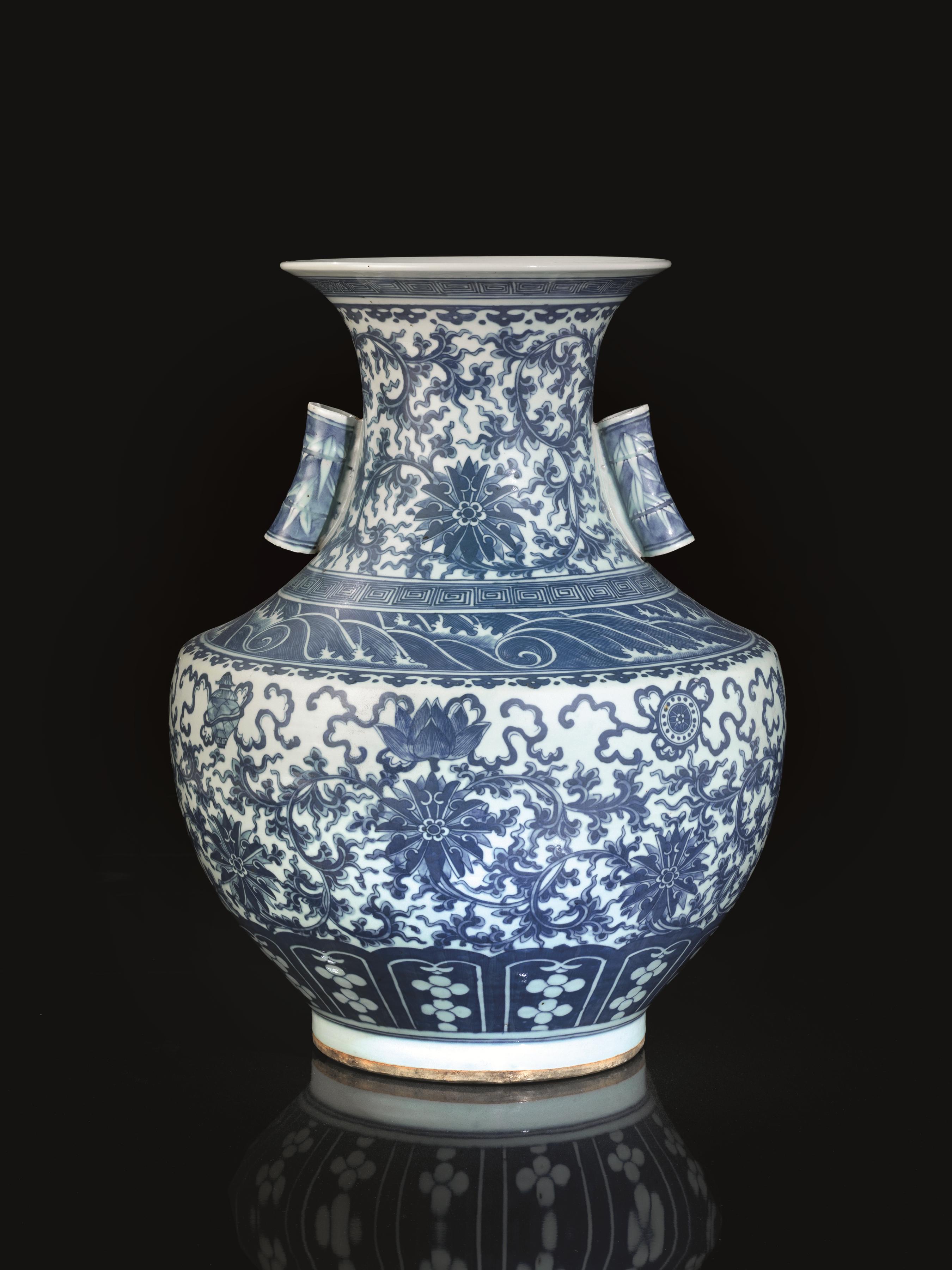 in porcellana bianca e blu decorato con grandi fiori di loto collegati da ramages, le anse decorate con orecchie cilindriche alt. cm 52